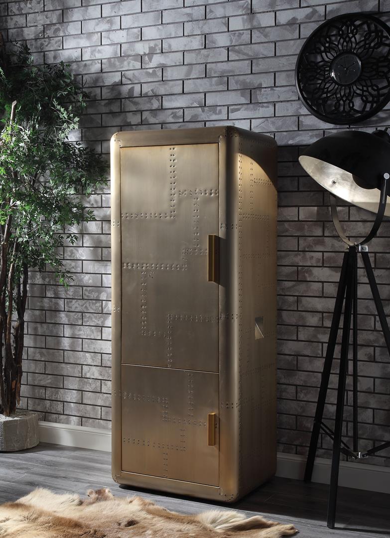 Redefine your space with a modern look and industrial styling with the Jennavieve side pier. This rectangular trunk style side pier features magnificent gold aluminum patchwork with 20th-century riveting details. The stunning table is accented with two doors with four storage compartments. This beautiful TV stand will modernize any space you place it.