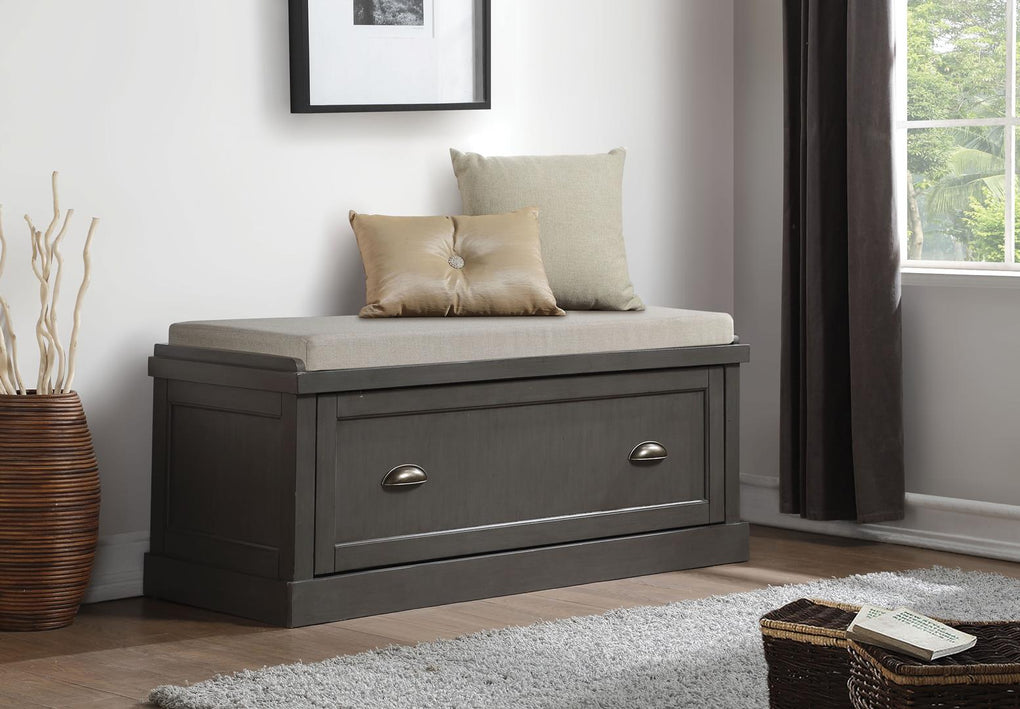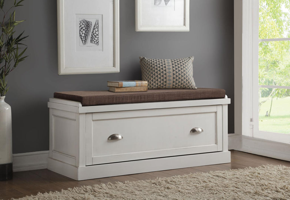 The Aislins storage bench offers functional storage and seating capabilities that you will grow to love. This white wash rectangular bench with fabric seat cushion has 1 front sliding door which is perfect for hiding your shoes as you walk in. Place this bench in your hallway, laundry room or living room for a functional stylish storage solution.