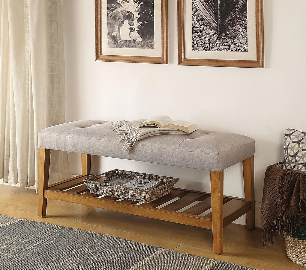 Simplistic lines pulling from the craftsman era and tapered legs to add some style, the Charla bench with button tufted full box seat can easily compliment any home styling Decor. The added width of the bottom slats serves as a function shelf. There are 4 fabric colors offered: Light gray, beige, blue, and gray.