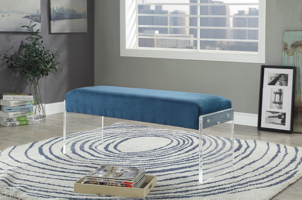 A nice mix of two contrasting materials, the Marah bench features clear acrylic sled base, which provides sturdy support for the fabric cushioned seat. This attractive bench will give any space a hint of elegant charm. Place this chic tufted bench anywhere you need an eye-catching accent or extra seating.