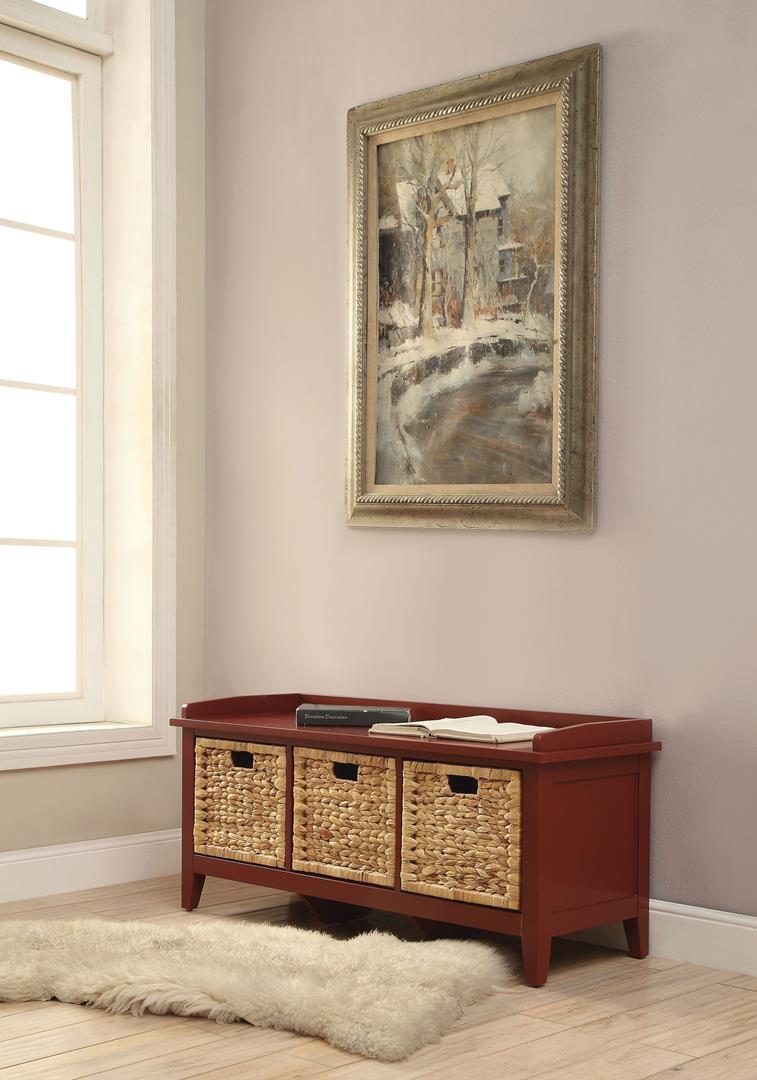 Keep your entryway fresh and organized with this lovely Flavius storage bench, featuring three spacious brown rattan baskets like drawers. The low-profile design, and crisp finish make for charming windowsill seating. This bench is also perfectly suited to update the bathroom, dressing area, or living room. From small spaces to wide and roomy, ample interior storage keeps messes tucked away. Some assembly required.