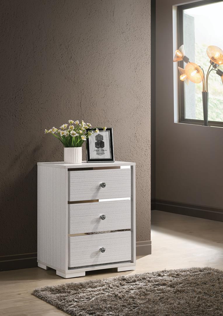 High gloss cream finish wraps the Sakura nightstand for a casual yet contemporary look to be added to your home. 3 drawers with side metal glide. With this chic contemporary nightstand, a casual yet contemporary look will be added to your bedroom space. Modern details and clean lines increase contemporary feel.