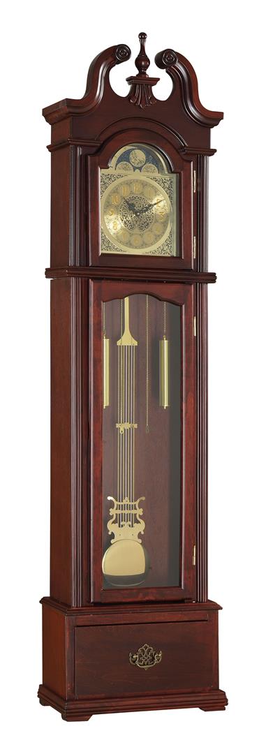 This Valentine Grandfather Clock features a traditional style with a classic cherry finish. The clock has a gold-finished clock plate with detailed carved accents and crown and chimes that strike on the hour. The clock also has a silent function for the late evening and early morning hours. The clocks sentiment and charm will add the finishing touch to your home decor, with elegance and decorative flair that is capable of giving your home a beautiful look. This timeless Grandfather Clock will bring an element of class and culture to any room.