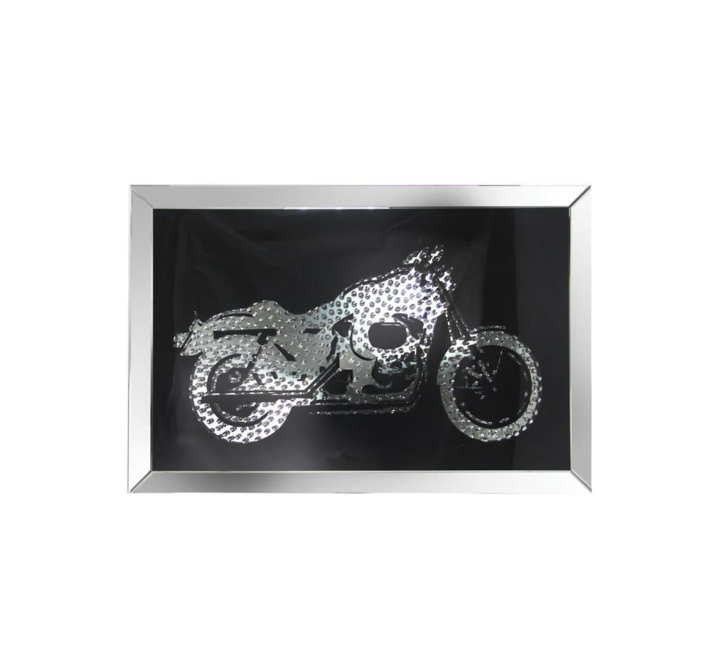 The Nevina crystal wall mirror is sure to be the focal point of any room. Dramatically cast with a bike shaped mirror that is the perfect contrast against a black background. Faceted optic glass crystals adorn the skill layering it with added luxe and brilliance. To complete the look, a beveled mirrored border frames the piece creating an intricate play of light and refection.