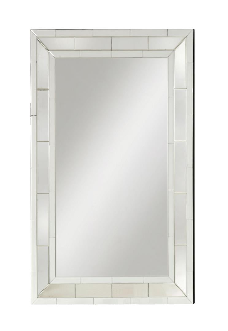 The Nerissa mirrored wall accent mirror is sure to be the focal point of any room. Dramatically cast with a contrasting geometric pattern made with mirror and tile. Faceted optic glass crystals adorn the skill layering it with added luxe and brilliance. To complete the look, a beveled mirrored border frames the piece creating an intricate play of light and refection.