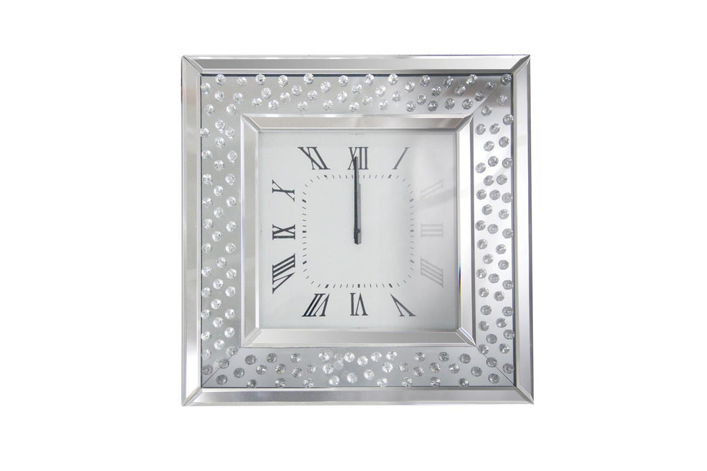 The Nysa floating crystal wall clock, is sure to be focal point of any room. This stylish wall clock features a square mirror frame inlaid floating crystals around the face. The clock face has a clean, modern look featuring roman numerals.