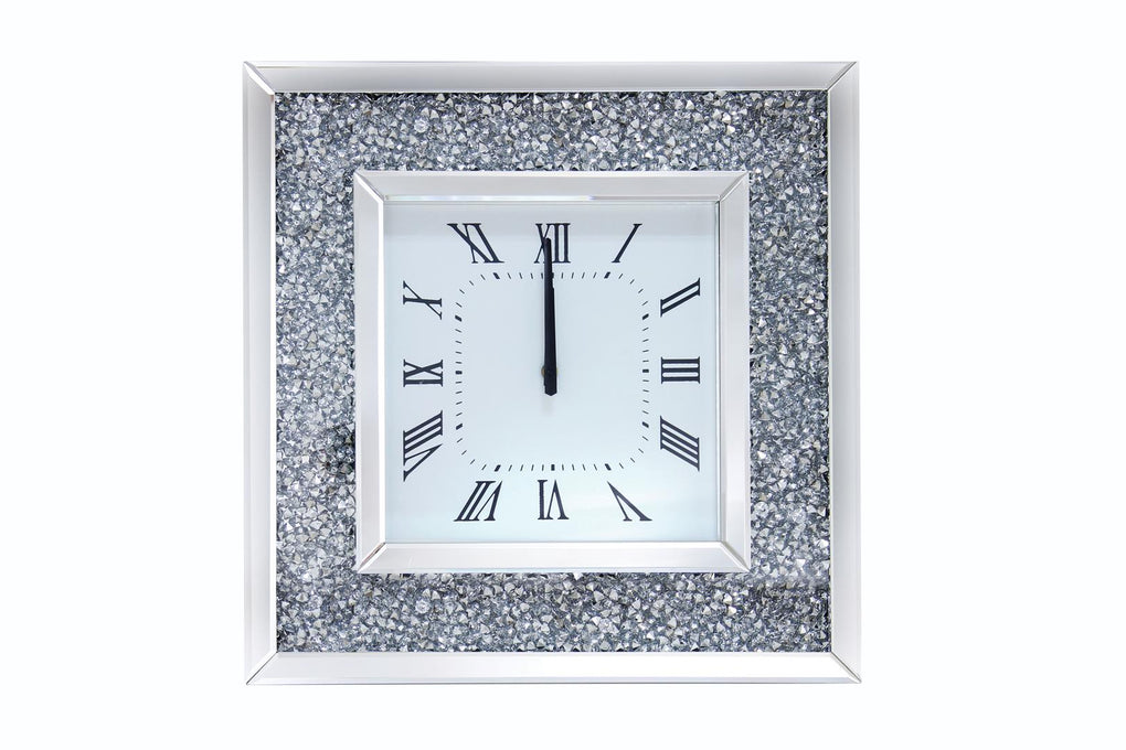 The Noralie floating crystal wall clock, is sure to be focal point of any room. This stylish wall clock features a square mirror frame inlaid floating crystals around the face. The clock face has a clean, modern look featuring roman numerals.