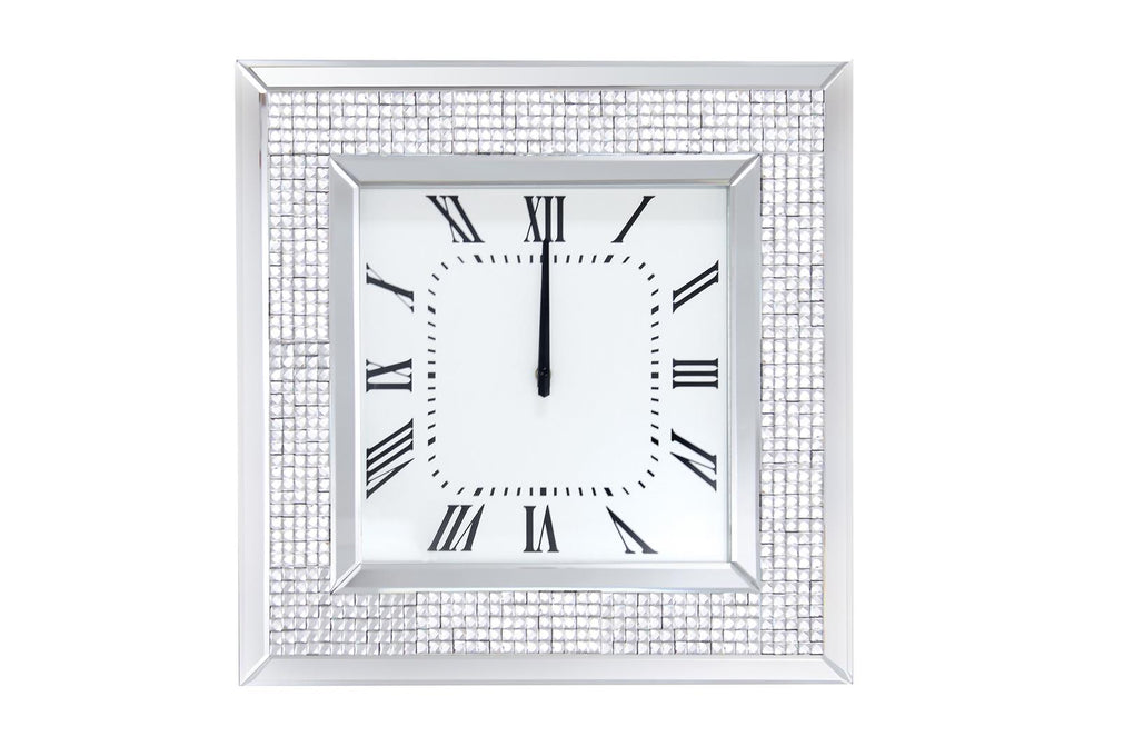 The Iama floating crystal wall clock, is sure to be focal point of any room. This stylish wall clock features a square mirror frame inlaid floating crystals around the face. The clock face has a clean, modern look featuring roman numerals.