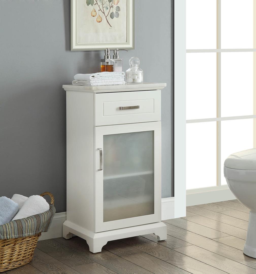 Expertly crafted the Sakya cabinet will bring simplicity and a warm contemporary style into your bathroom. Featuring a wood frame, marble top a top drawer and a tempered glass door on the bottom, it offers elegance and sufficient storage space for your essentials. With its white finish, it effortlessly blends in with any bathroom décor.