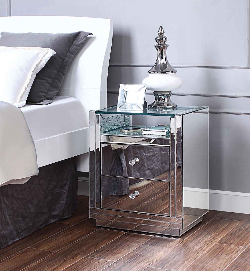 The Nysa End Table will give any room a touch of glamour. This contemporary nightstand is fully mirrored with a beveled edge and stunning glass top with a storage shelf surrounded by faux crystal inlay. Use this unique piece as the perfect accent for any room Decor. Two large drawers provide ample and convenient storage for books, remote controls, jewelry, and more.