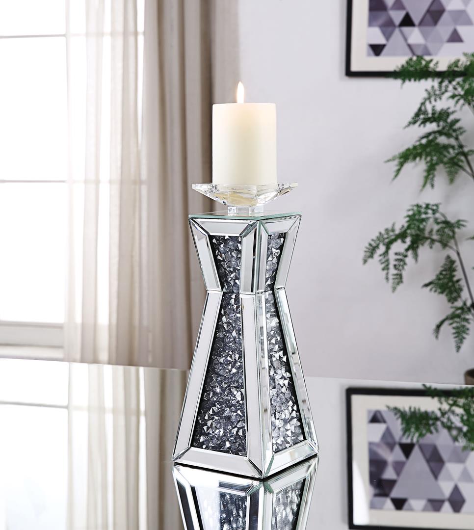 Strut your style with this beautiful and elegant Nowles candleholder collection. With a beautifully crafted mirrored frame and faux gem inlay, it is sure to compliment any arrangement. Available in two different sizes, light it up and be dazzled by the glamour of this piece.