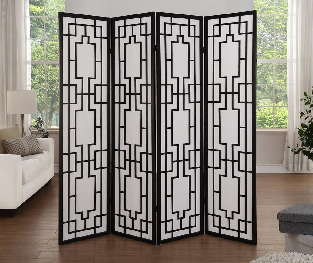 The Cecilia 4-Panel Screen Room offers an attractive geometric pattern that will add privacy to a bedroom, dorm or other open space. Its hinged panels fold back for compact storage. No assembly is needed.