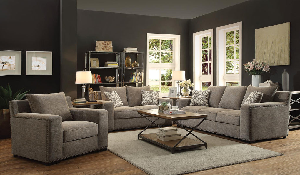 The Ushury loveseat has the elegance of contemporary fashion. It features decorative Nailhead trim around the outside of the arms and base, loose seat cushions and back filled with standard down feathers, two pillows, and wooden block legs. The gray chenille upholstery brings a soft and stylish addition to any seating area. This loveseat is sure to be a great addition to any living room. Fully Assembled.
