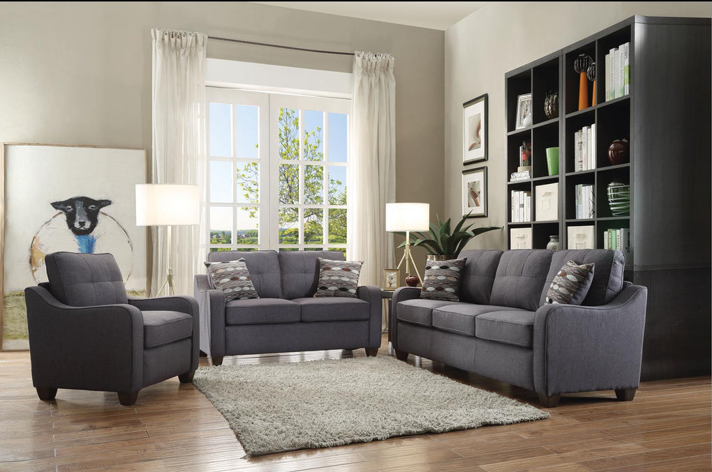 Styled in Cleavon II collection, this gray upholstery piece will bring you a modern and comfortable sensation in the living room. Featuring with sloped arms, loose seat and back cushion, plastic wood grain legs, and colorful accent pillows present you a better and soft environment with family and friends.