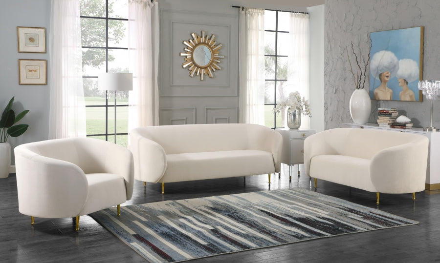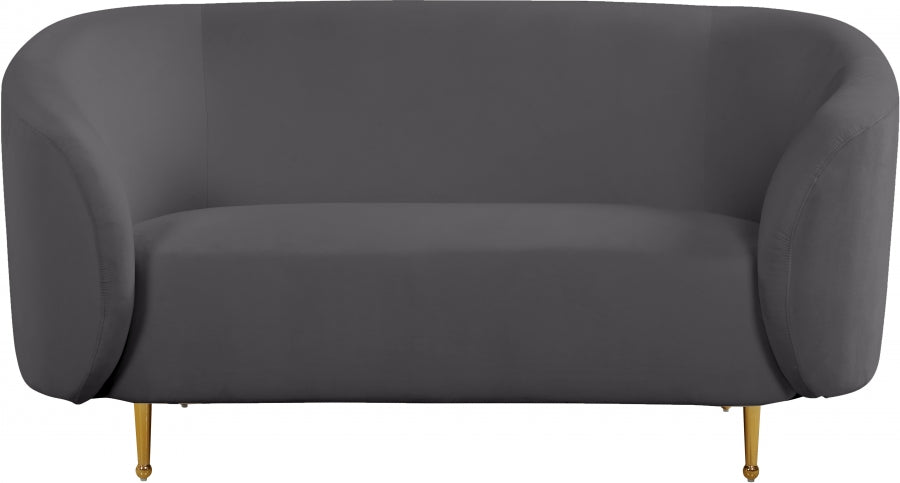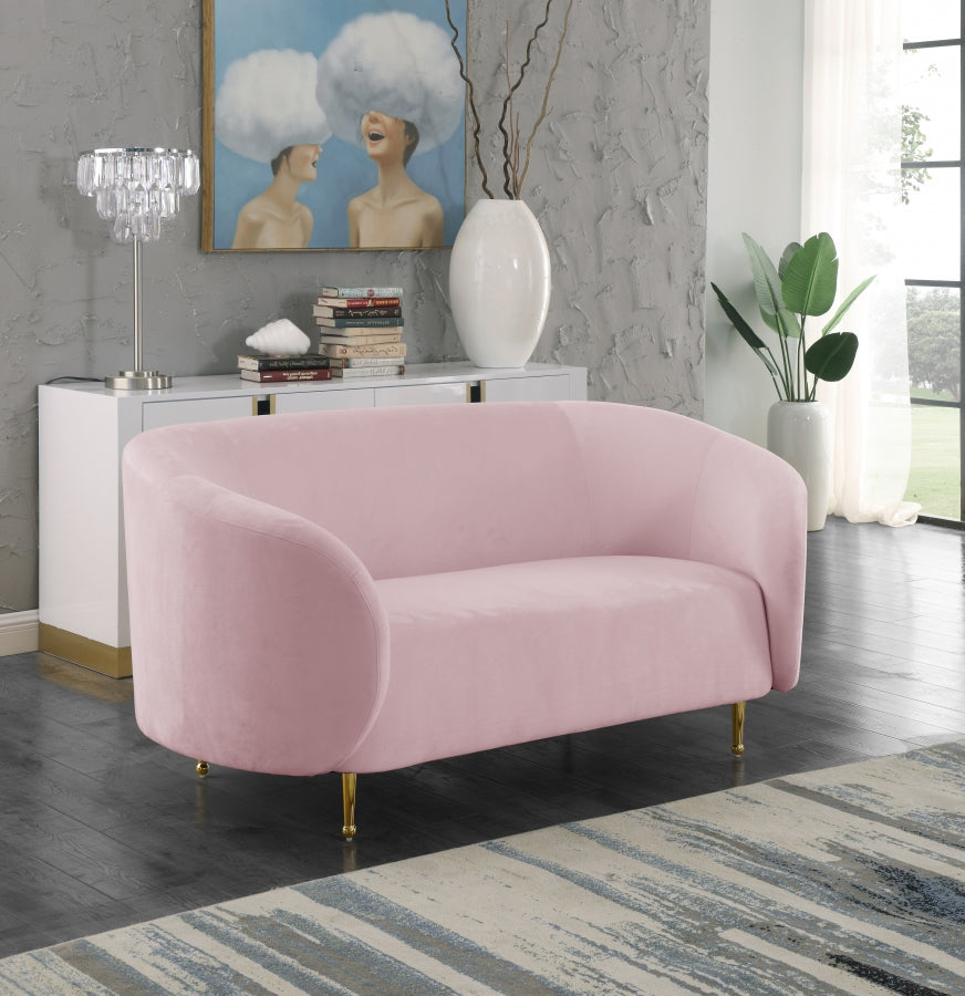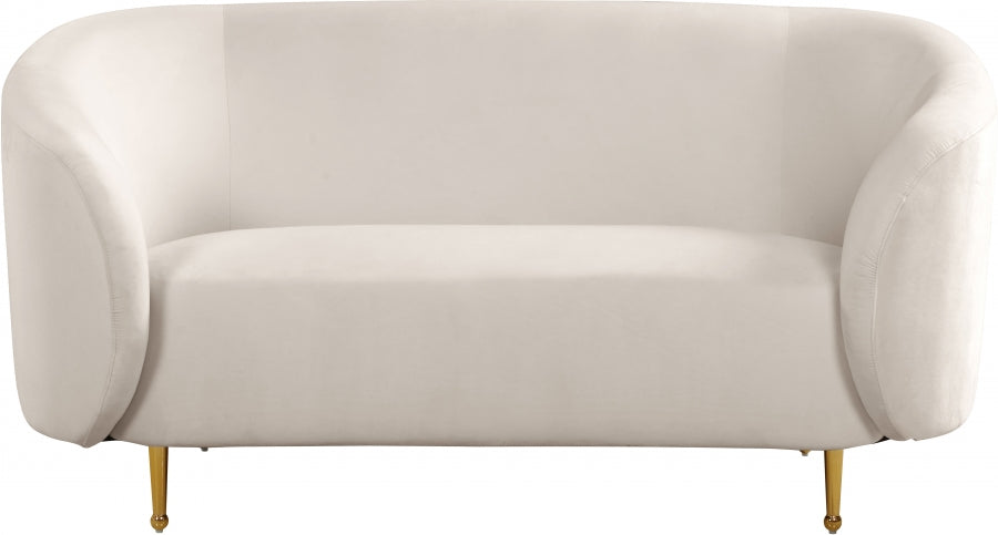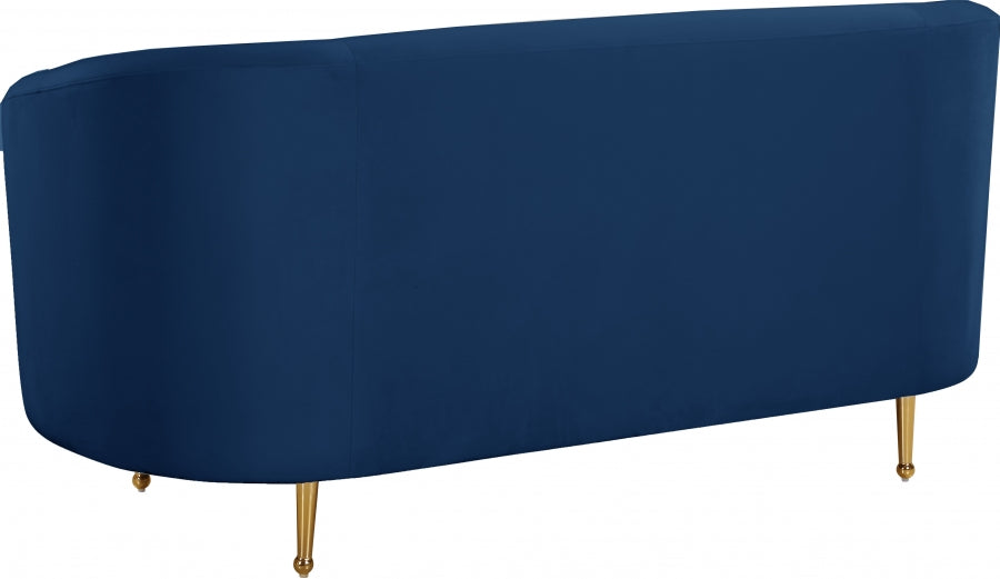 Transform your living space into an elegant dream with this Lavilla navy velvet loveseat. Soft velvet upholstery and plush cushions please the senses, while its roomy design provides ample room for you to rest. Curved arms offer support while you sit and sip your favorite hot tea or read a good book, and gold legs complement the dreamy cream-colored upholstery, making this chair the embodiment of perfection for any contemporary living room, bedroom, or den.