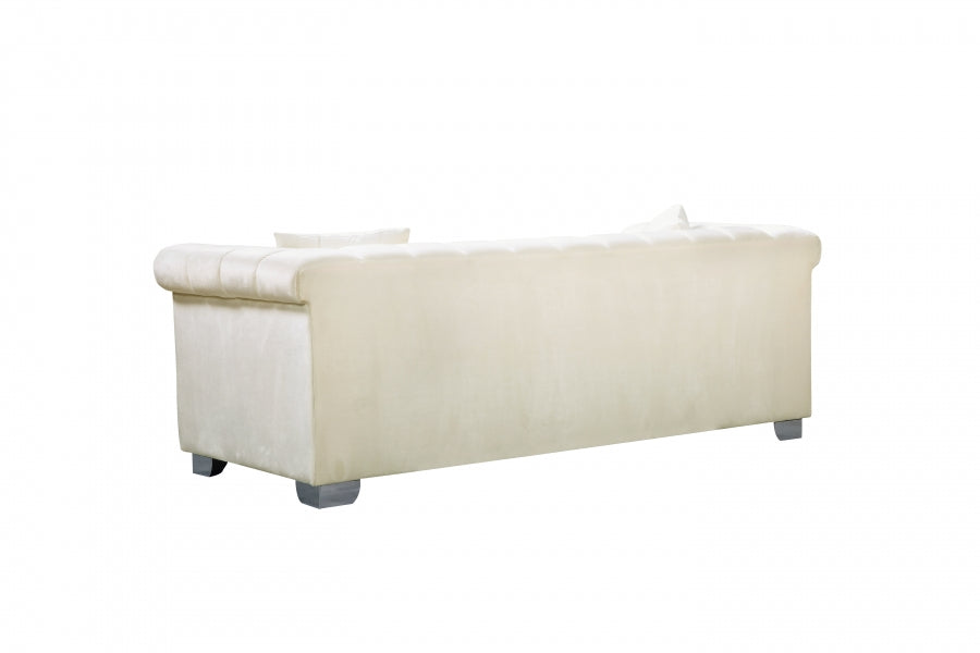 The Kayla Collection by Meridian Furniture. Features beautifully designed velvet upholstery with custom chrome legs. This collection is guaranteed to be the highlight of any home. Throw pillows included.