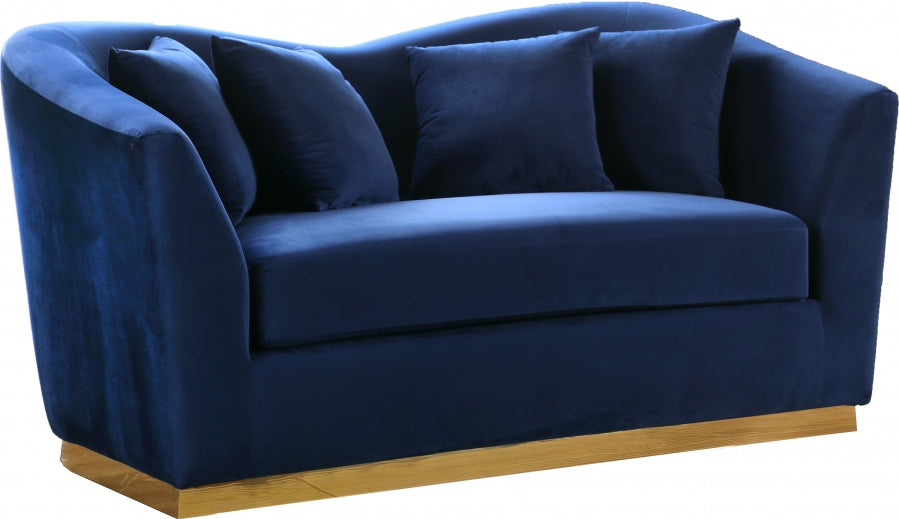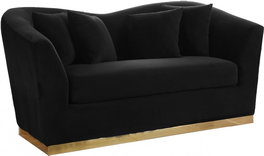 Make the Arabella Black Velvet loveseat your favorite naptime spot. This handsome loveseat is upholstered in black velvet for a glamorous touch and is accented with gold stainless steel around its base for a touch of modernity. Its curvy back gives it a graceful look in your living room or den, and it comes with coordinating throw pillows that beckon you to sit down and rest (or nap) for a spell.