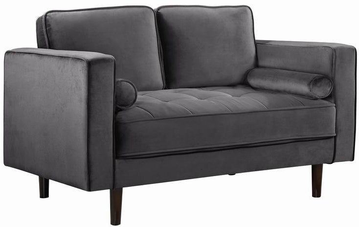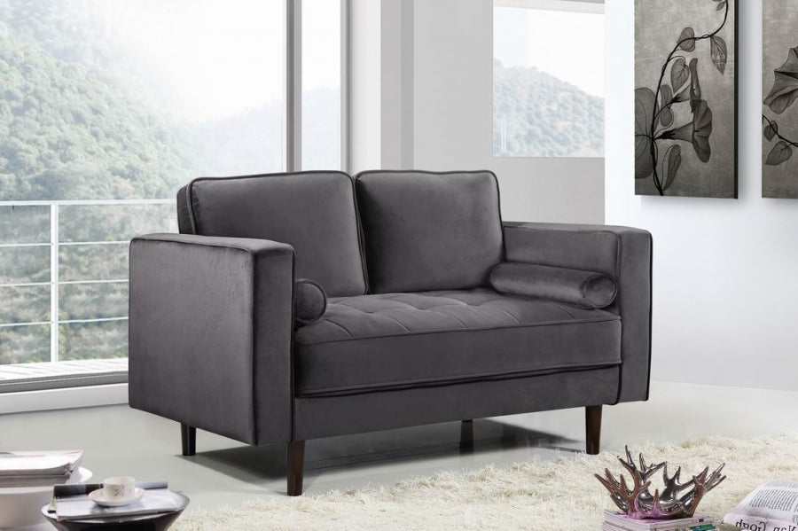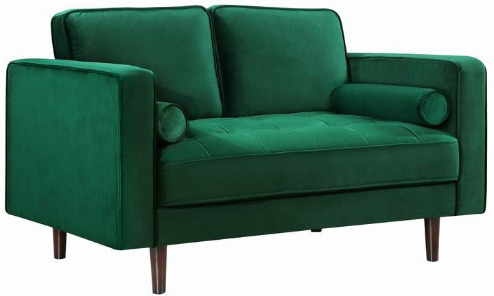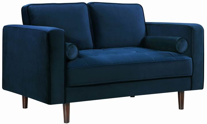 Stretch out and relax on this handsome Emily loveseat. This Meridian Furniture loveseat features wooden legs and a sturdy frame, so it's built for the long haul. Its vibrant navy velvet upholstery is a jewel tone that's simply stunning and that adds a pop of color to your day. The loveseat's back cushions are plump and filled with premium material to cradle you in comfort, and it comes with two roll-style pillows for helping you prop up and unwind.