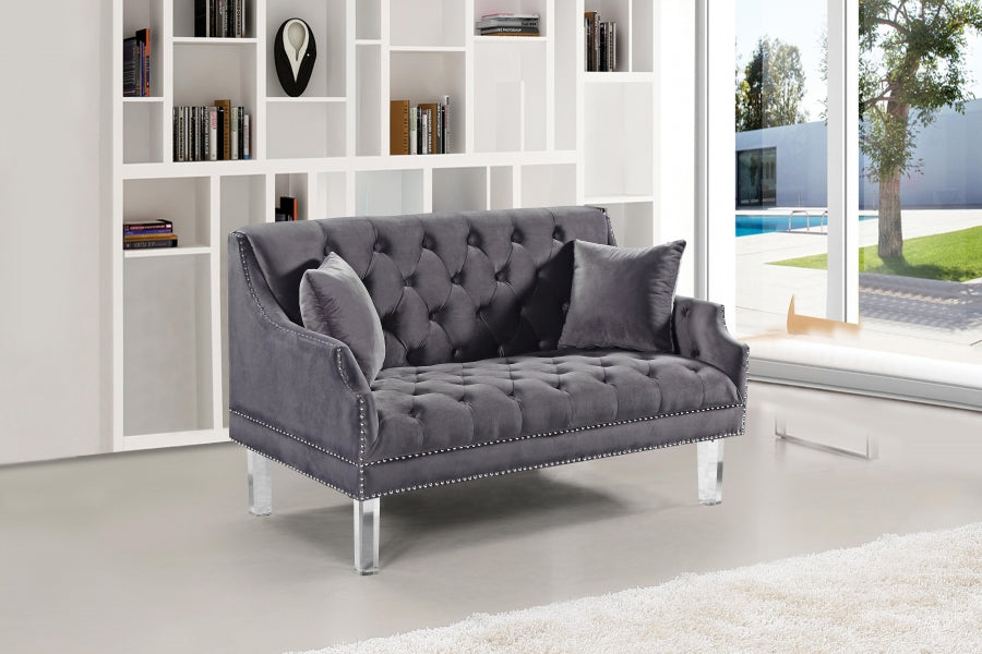 Bring a posh look home with this Roxy Grey Velvet Loveseat. The velvet is both striking yet unobtrusive, giving your room an elegant style boost while providing you with a comfortable spot to sit and relax while reading or watching TV. Deep button tufting gives the loveseat a touch of texture while ensuring its sophistication is lost on no one. Add this contemporary loveseat on its own to your living room or den, or buy it alongside the coordinating sofa and chair for a complete and total makeover.
