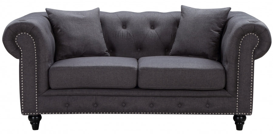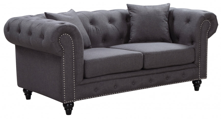 Elegant and eye-catching, the stunning Chesterfield Living Room from Meridian Furniture is the perfect addition to any space. Rich Linen covers the plush, comfortable seat, padded with high-density foam and modern tufted design. Strength and beauty is guaranteed with a solid wood frame and legs. Features a nail head design on the arms and includes matching throw pillows.