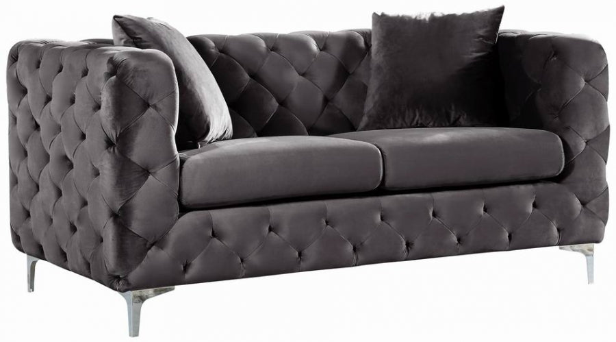 Sink into the welcoming comfort of this Scarlett navy velvet loveseat. This loveseat defines elegance and sophistication with its boxy retro look and its deeply tufted upholstery that covers every inch of the sides, back, and front. The navy velvet material feels luxurious to the touch while the chromed legs lend the loveseat sturdy support and a modish finish. Pair it with other items in the Scarlett collection for a complete look.