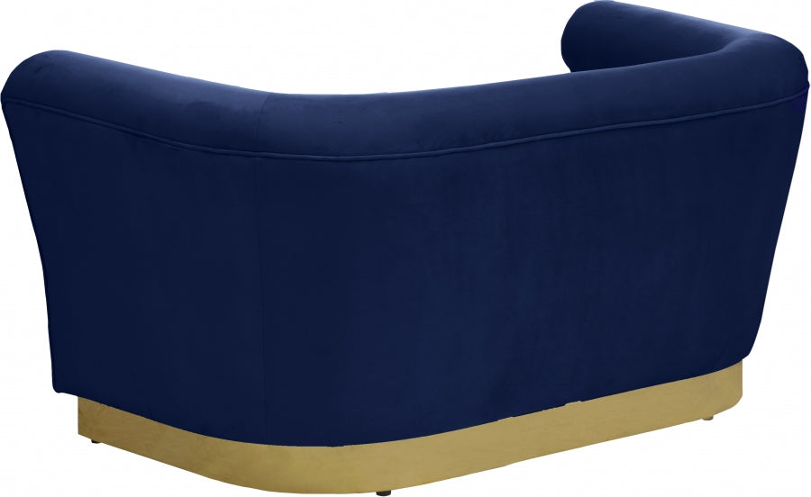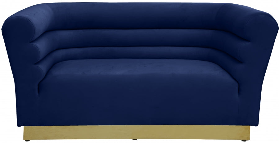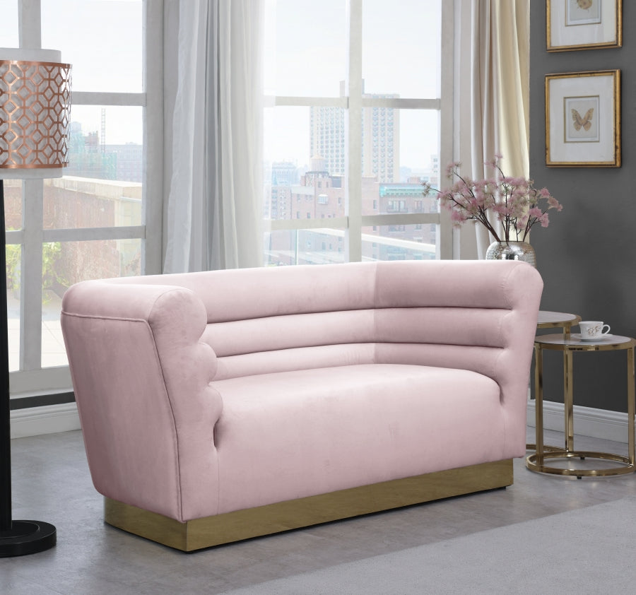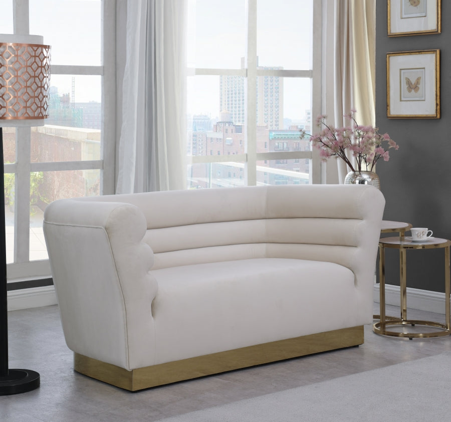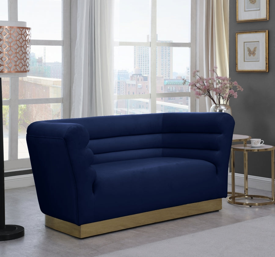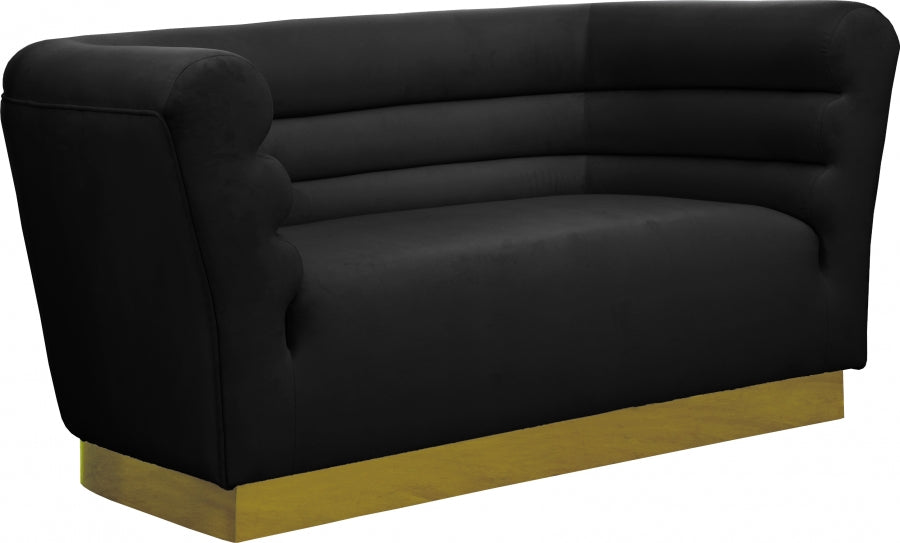 Add a bit of pizzazz to your living space with this Bellini Black Velvet Loveseat from Meridian Furniture. Rich black velvet upholstery offers you a luxurious place to curl up with a good book or rest in front of the TV after a long day, while horizontal channel tufting creates texture and style. Its gold stainless steel base provides solid support, while adding to the loveseat's contemporary appearance. Its uniquely curved shape makes this piece a perfect addition to any room in your modern home.