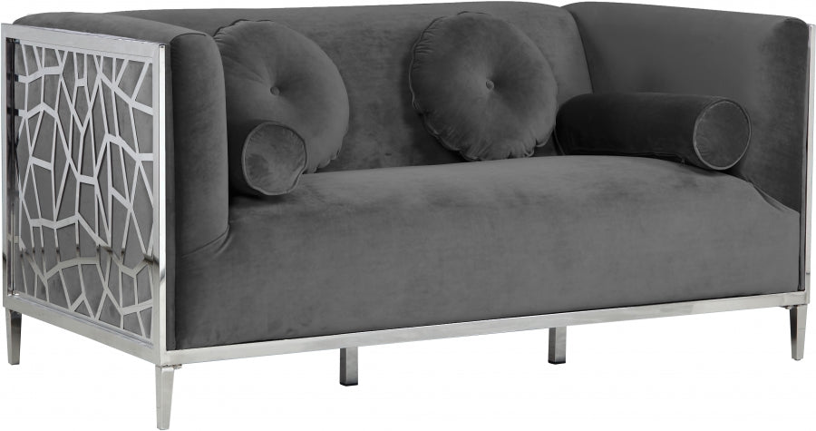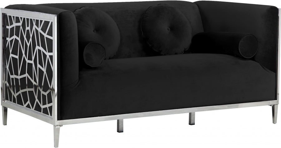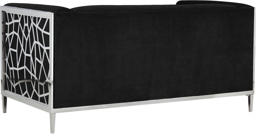 Catch the eyes of all who step foot in your home with this bold Opal black velvet loveseat. Its chrome stainless steel patterned design creates a contemporary flair against its plush, black velvet upholstery, creating a home accent piece that is both comfy and stylish. Its roomy design offers ample room to kick back and relax after a long day, while its stocky shape adds a daring touch to your decor.
