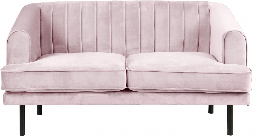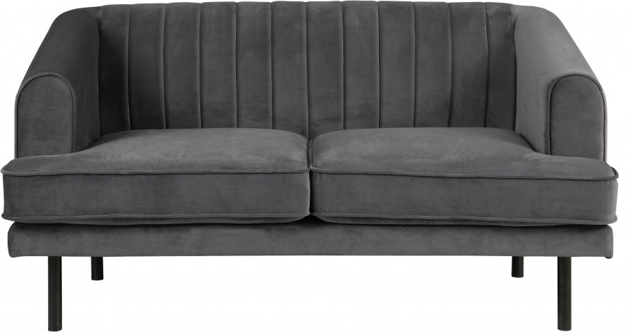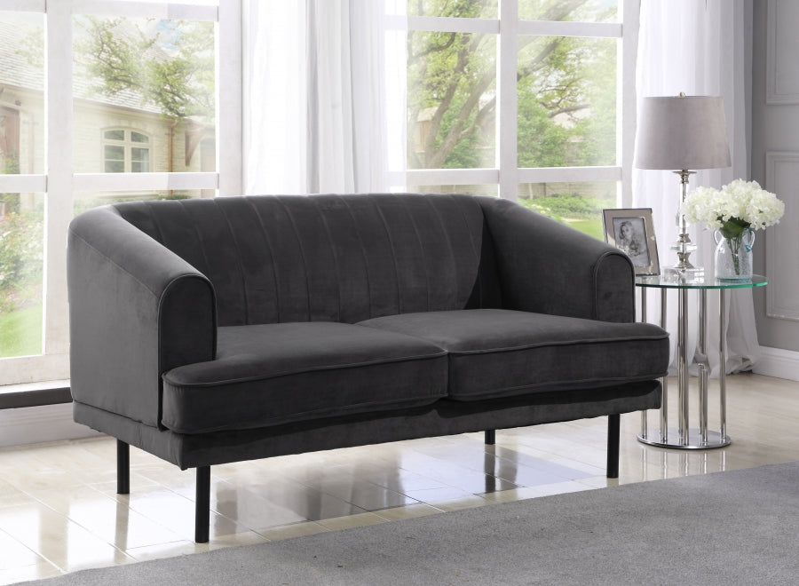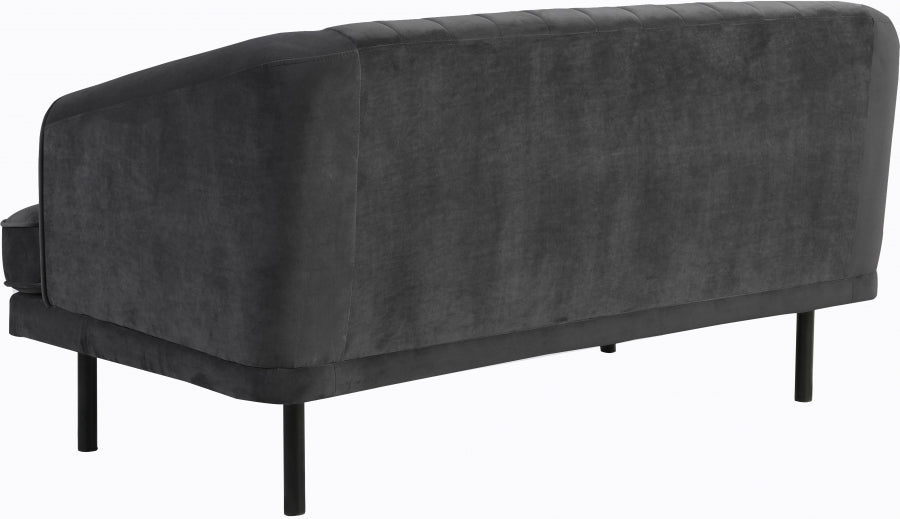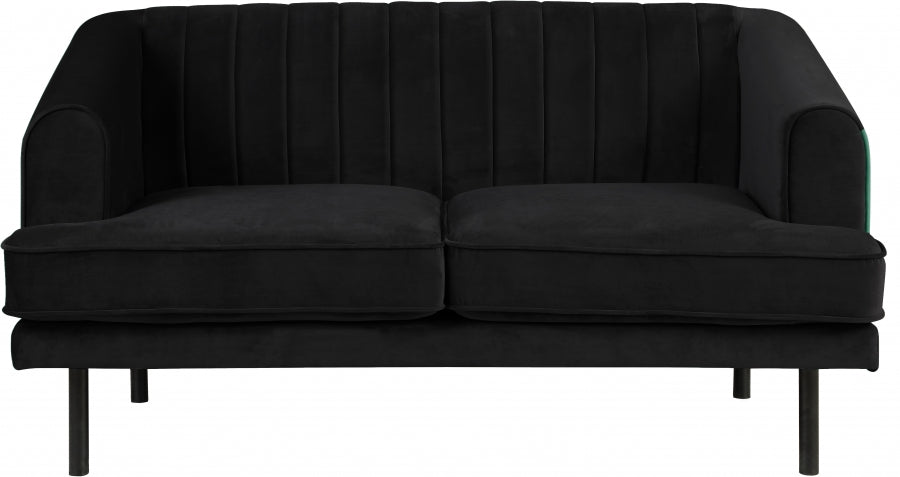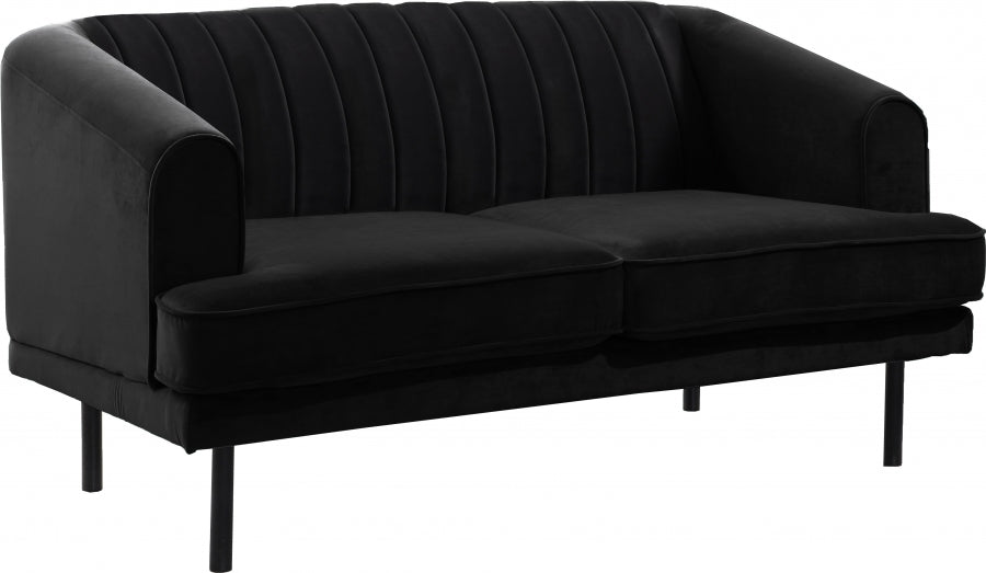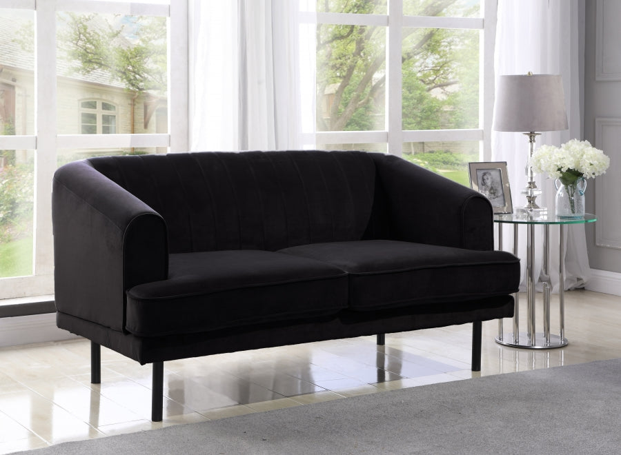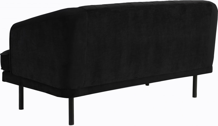 Give your living space a sophisticated makeover with this Rory Black Velvet Loveseat from Meridian Furniture. Rich black velvet upholstery offers luxurious space for you to curl up and relax, while channel tufting adds texture and contemporary appeal perfect for any room in your home. Matte black legs lift the chair loveseat enough off the ground to make vacuuming beneath it a piece of cake, while also providing sturdy support while you recline in elegant fashion.