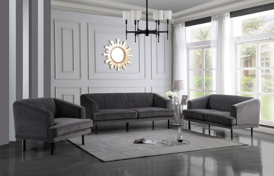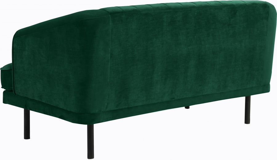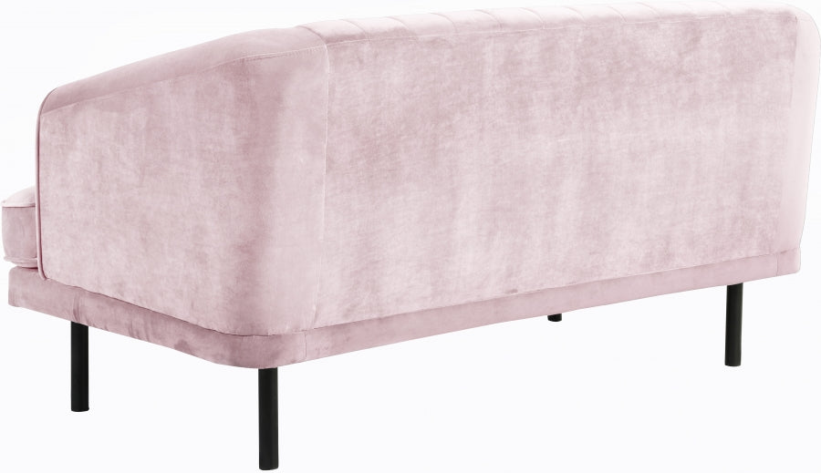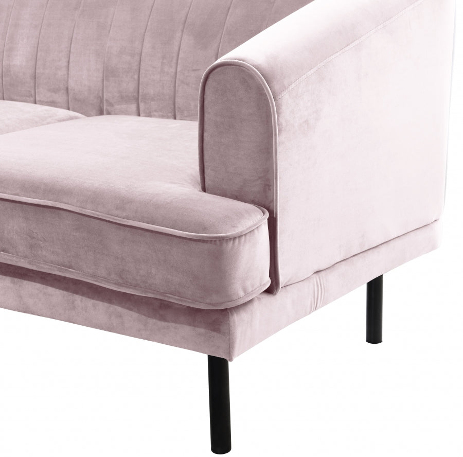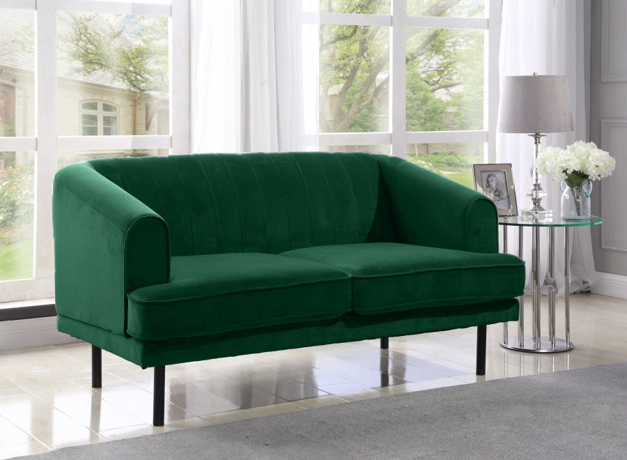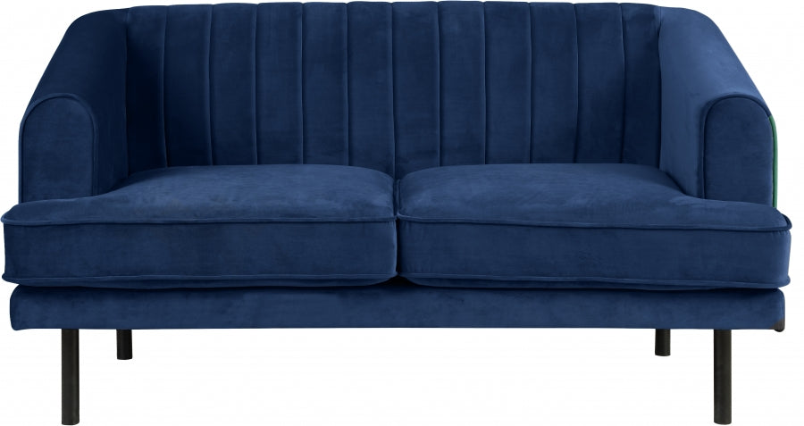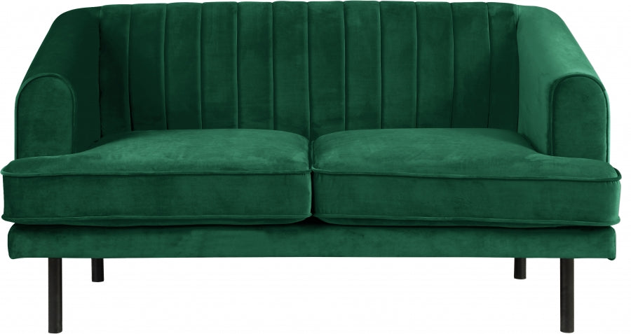Give your living space a sophisticated makeover with this Rory Black Velvet Loveseat from Meridian Furniture. Rich black velvet upholstery offers luxurious space for you to curl up and relax, while channel tufting adds texture and contemporary appeal perfect for any room in your home. Matte black legs lift the chair loveseat enough off the ground to make vacuuming beneath it a piece of cake, while also providing sturdy support while you recline in elegant fashion.