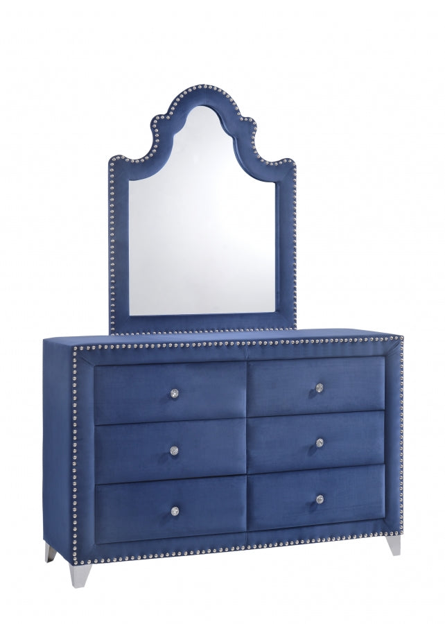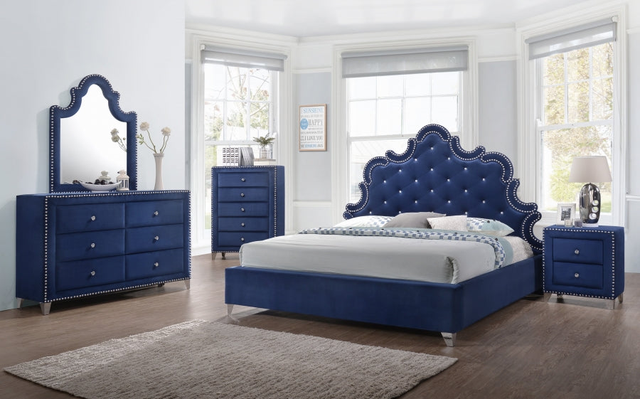 The Caroline Bedroom Set, By Meridian Furniture. This beautiful bed features a custom design upholstered in a beautiful velvet fabric. Garnished with crystal tufting and a nail head trim, this bedroom set is guaranteed to make you feel like royalty.