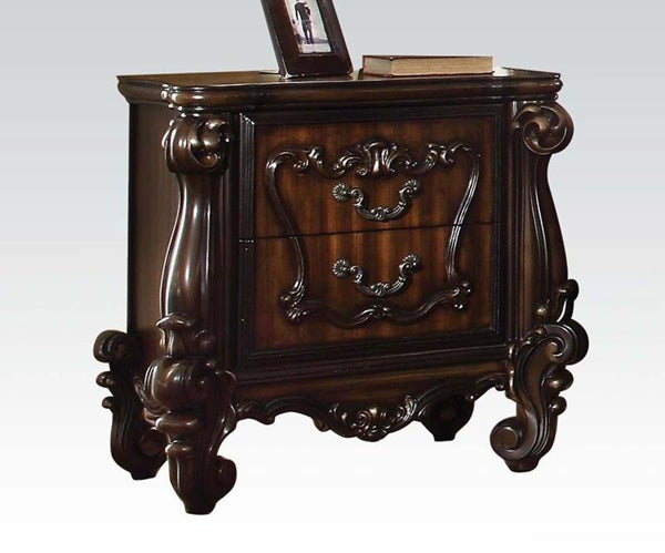 The Versailles nightstand is the perfect accent to create the style of royalty your bedroom has been needing. This nightstand crafted in wood with cherry oak finish was inspired by old European design with brown copper metal hardware and intricate wood carvings on the front of the two drawers.