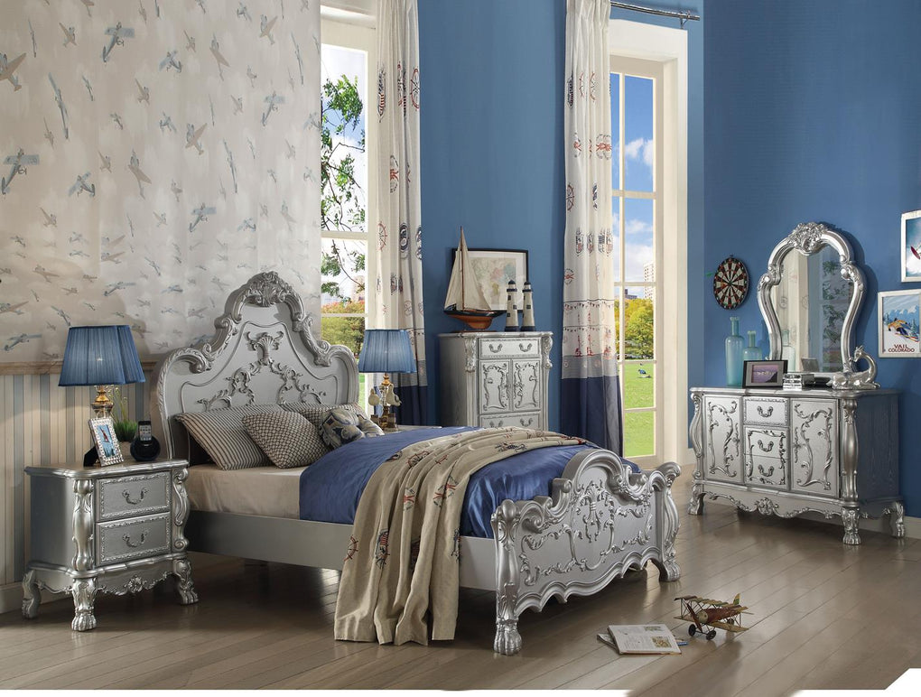 The Dresden nightstand is a new rendition to a classic style, finished in silver. The antiqued look is further highlighted with hand applied burnish. This nightstand features two Felt-Lined drawers with detailed French front and back. Keep this nightstand close for easy access to your necessities and add a bit of class to any bedroom. Some Assembly Required.