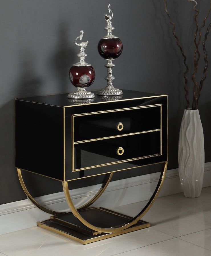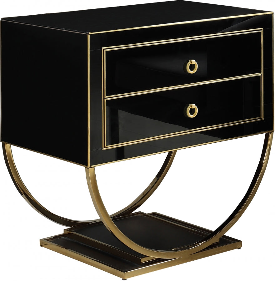 Top off your modern living room with the Alyssa Side Table from Meridian Furniture. This handsome table features a semi-circle base on a dual pedestal for an attention-commanding look. The black glass finish is trimmed in gold for a contrast that's nothing short of stunning. The double drawers help you organize everything from TV remotes to games and DVDs.