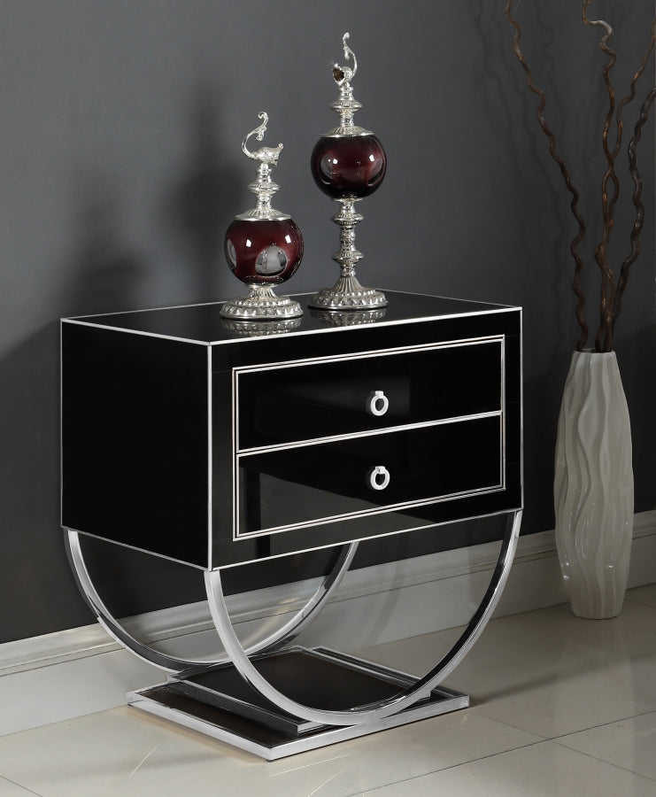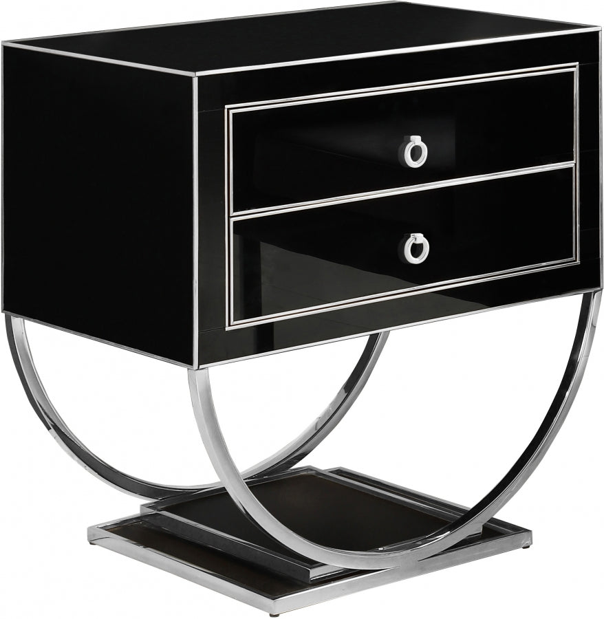 Top off your modern living room with the Alyssa Side Table from Meridian Furniture. This handsome table features a semi-circle base on a dual pedestal for an attention-commanding look. The black glass finish is trimmed in chrome for a contrast that's nothing short of stunning. The double drawers help you organize everything from TV remotes to games and DVDs.