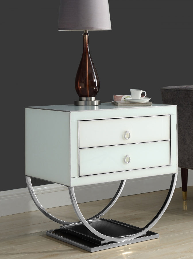Top off your modern living room with this Alyssa Side Table from Meridian Furniture. This handsome table features a semi-circle base on a dual pedestal for an attention-commanding look. The white glass finish is trimmed in chrome for a contrast that's nothing short of stunning. The double drawers help you organize everything from TV remotes to games and DVDs.