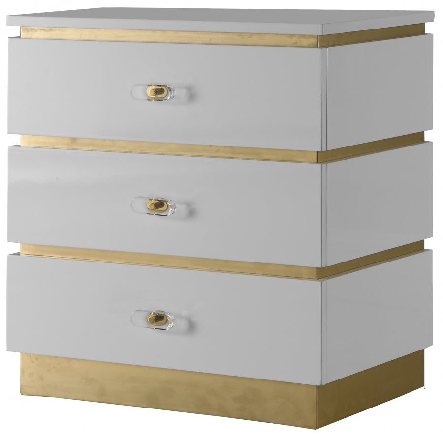 Go for an upscale, regal look in your room with this Esme Side Table. A sleek white lacquer finish adds a distinctive modern touch, and gold-finished trim on the painted wood base lends sophistication, style, and elegance to this handsome table. Three drawers offer roomy interiors for storing everything from bedside essentials to reading material, and a large top is sufficiently sized to accommodate a lamp, alarm clock, and other items. Use this Esme Side Table as a nightstand in the bedroom, or ring it into the living room as an end table for needed storage.