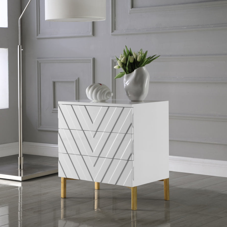 Bring up-to-the-minute style and design to the forefront with this Collette Side Table by Meridian Furniture. The crisp white lacquer exterior adds instant sophistication to your room, and the rich gold base adds to its modernity and contemporary feel. The Collette Side table has a distinct chevron pattern that traverses its three drawer fronts to form an interesting visual from all angles. An amply sized top lets you rest a lamp or other items easily.