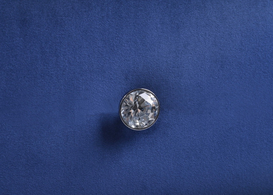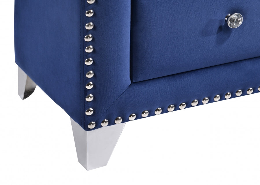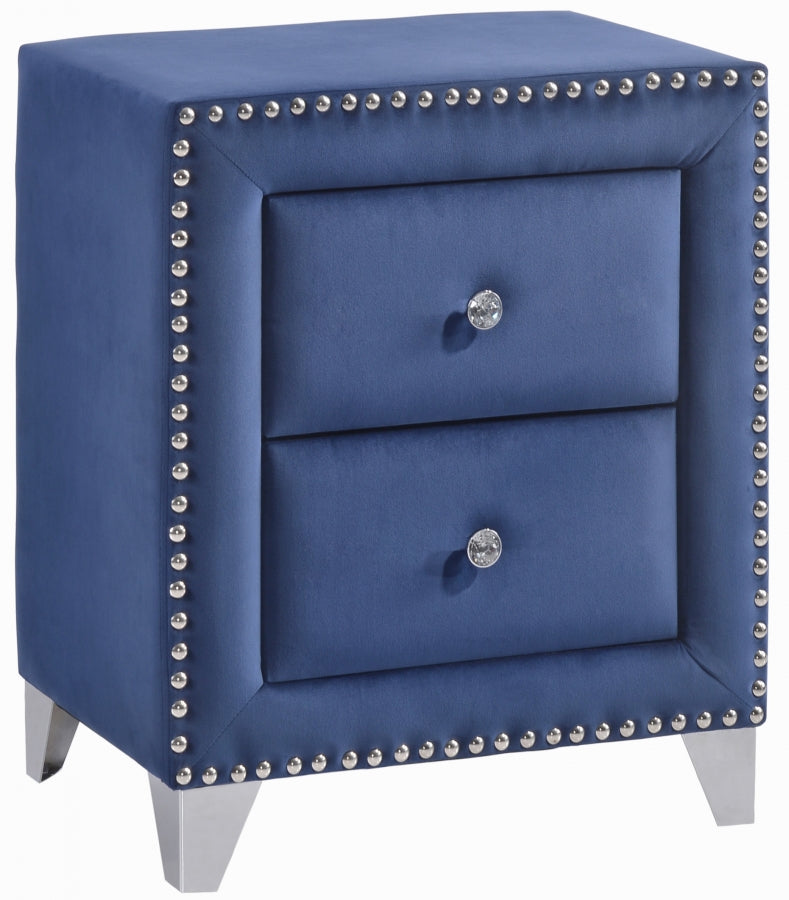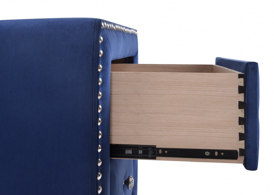 The Caroline Bedroom Set, By Meridian Furniture. This beautiful bed features a custom design upholstered in a beautiful velvet fabric. Garnished with crystal tufting and a nail head trim, this bedroom set is guaranteed to make you feel like royalty.