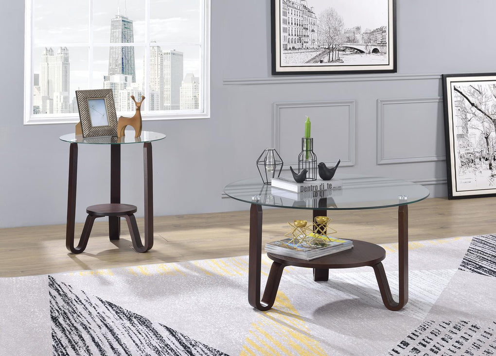 Entertain in style with the Darby End Table. This classic round occasional table features a dark walnut frame with a clear tempered glass top. This distinctive wood and glass cocktail table feature a unique V-Shapedd legs with an open lower shelf for storage and display. This stylish accent table has a captivating look that makes it an eye-catching piece in any room. Use it to add a touch of contemporary flair to a traditional space or to simply complete a modern aesthetic.
