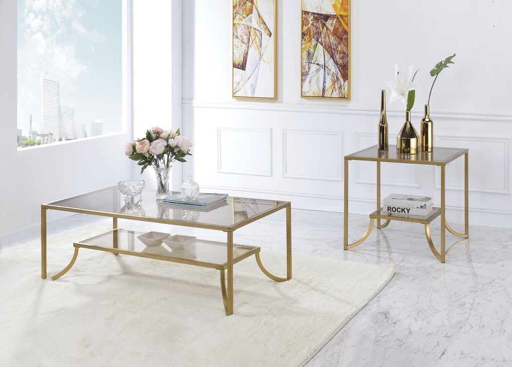 Entertain in style with the Magalie occasional set. This modern table features an antique gold finished metal base with a smoky tempered glass top. This distinctive metal and glass cocktail table feature a unique V-Shaped legs with an open lower shelf for storage and display. This stylish accent table has a captivating look that makes it an eye-catching piece in any room. Use it to add a touch of contemporary flair to a traditional space or to simply complete a modern aesthetic.