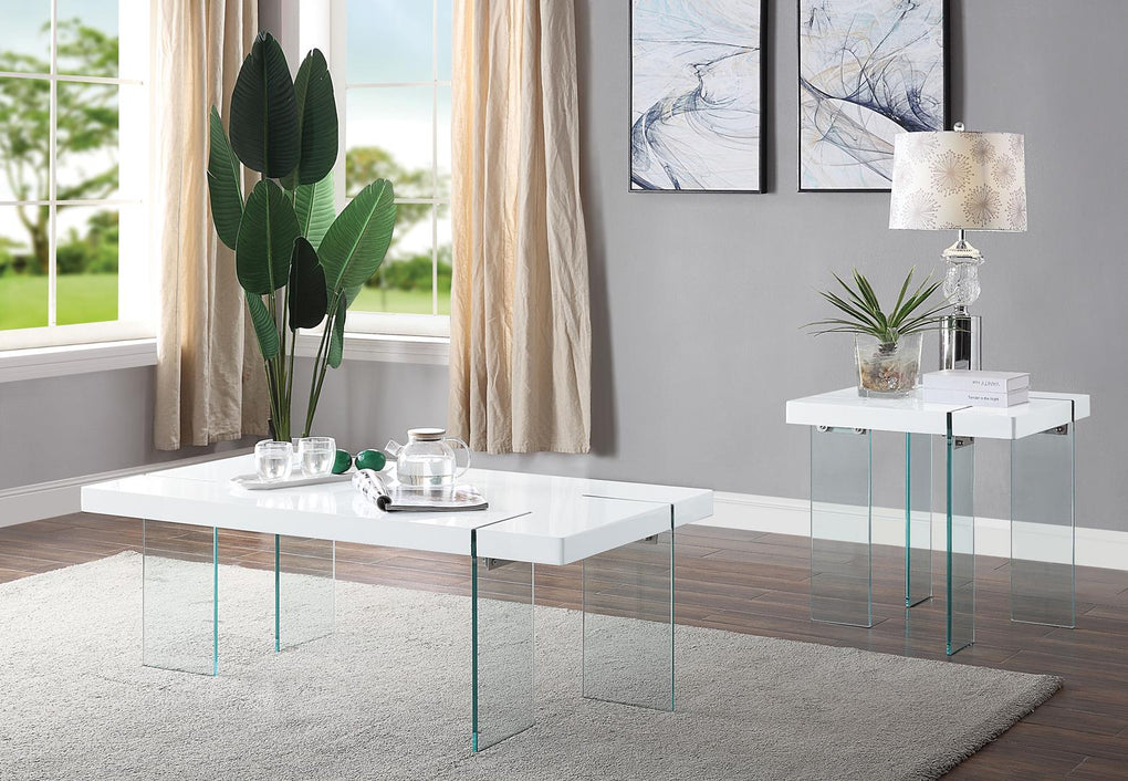 Enhance your living room with the Noland End table. This sleek square table features a white high gloss finish table top and a distinctive sled base. The modern tempered glass base is sturdy, while the tabletop provides more than ample space to entertain. The simple style of this unique accent piece complements a wide range of Decor and its modern design is a useful addition to any living area.