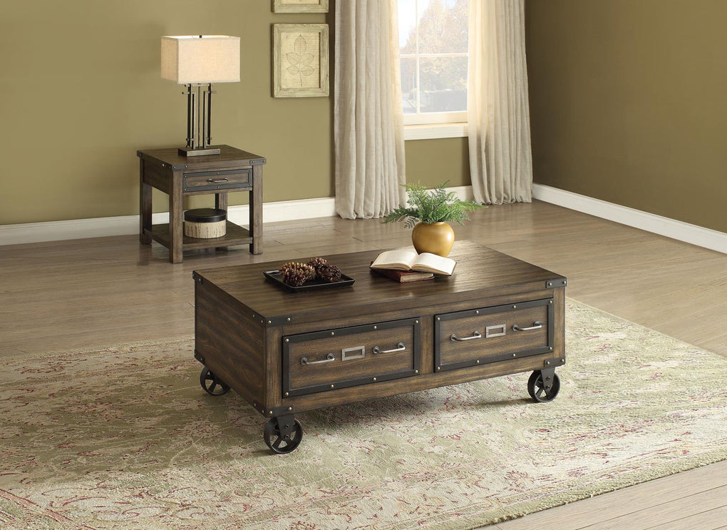 The Kailas occasional table collection flawlessly transforms the atmosphere of any living room environment, with its rich weathered dark oak beauty radiating from the stylish and functional details. The metal nailhead trim detail is beautifully bathed in the dark oak finish that flows over the framed details and casters to create a table collection that perfectly captures the ideal of industrial design.
