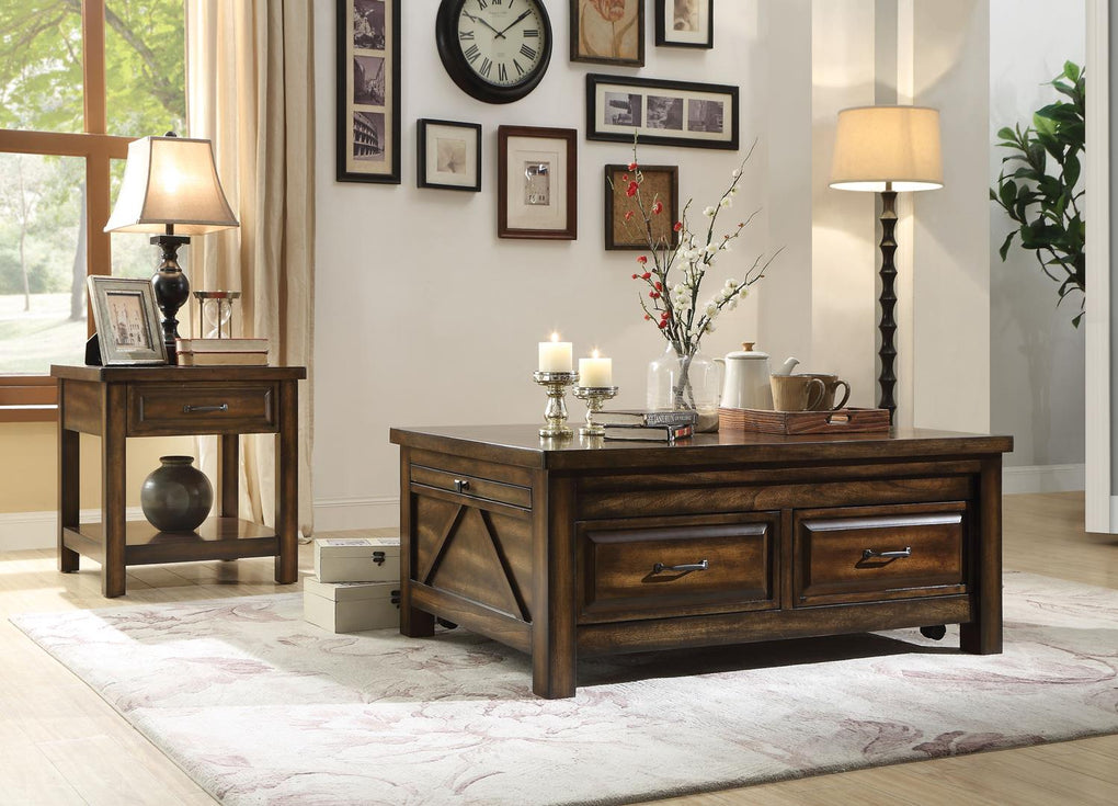 - Storage: Coffee Table w/Drawer & Tray; End Table with 1 Drawer & Open Compartment