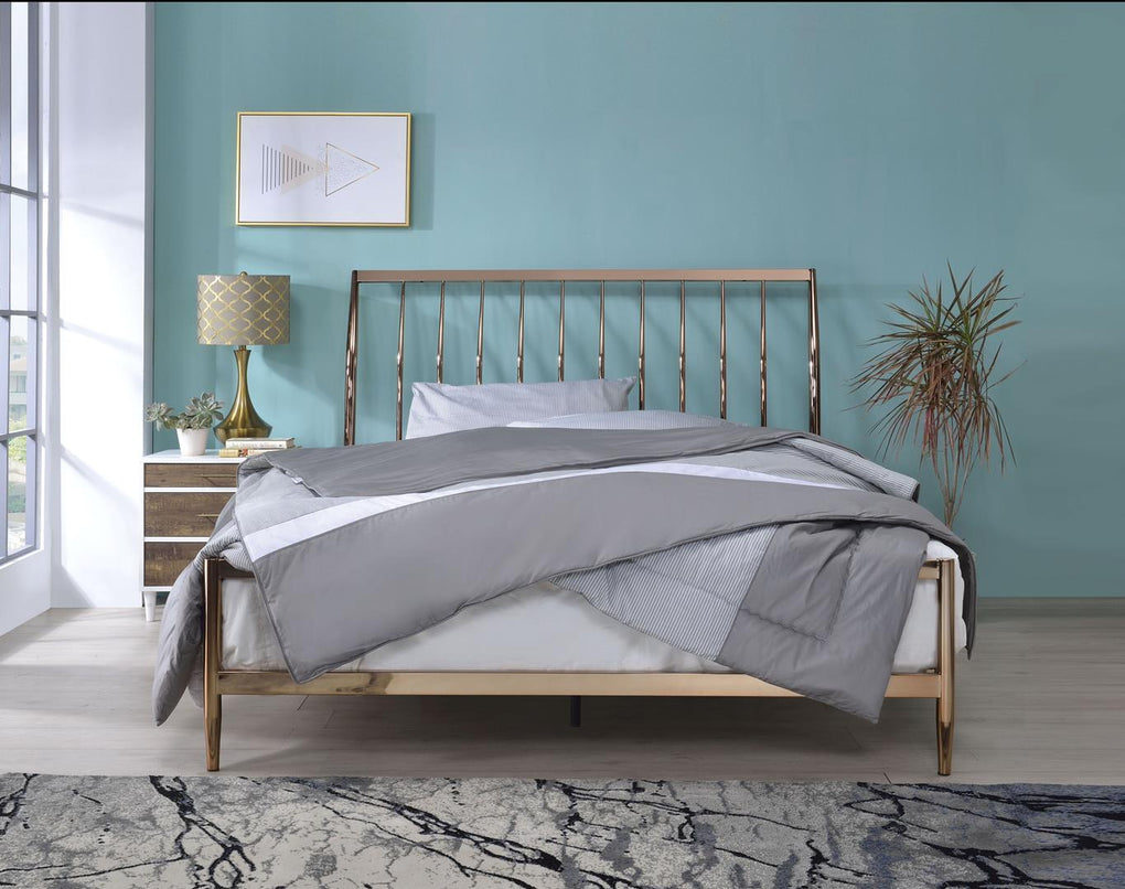 The Marianne Queen bed delivers a commanding presence in any room. This beautiful sleigh bed in copper finish features a low profile footboard, slatted design headboard, and tapered legs. This fashionable bed will fuse with the surrounding décor to transform an ordinary room into something interesting and sophisticated.