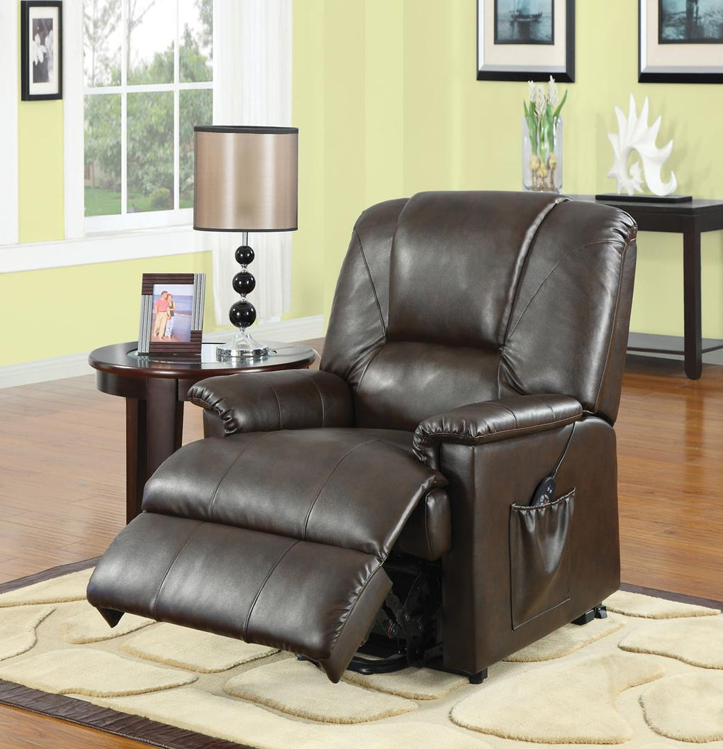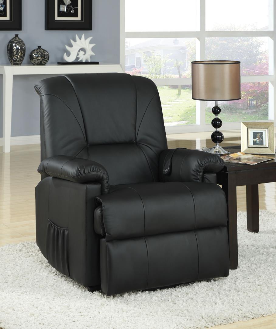 Relax after a long day of work on this comfortable Reseda recliner, with power lift and recline features. With black faux leather upholstery, this recliner offers comfort that contours to the shape of your body, and has a massage function. The power recline, lift, and massage options are conveniently controlled by remote, which can easily be hidden in the side pocket. This chair is perfect for any seating area of your home.