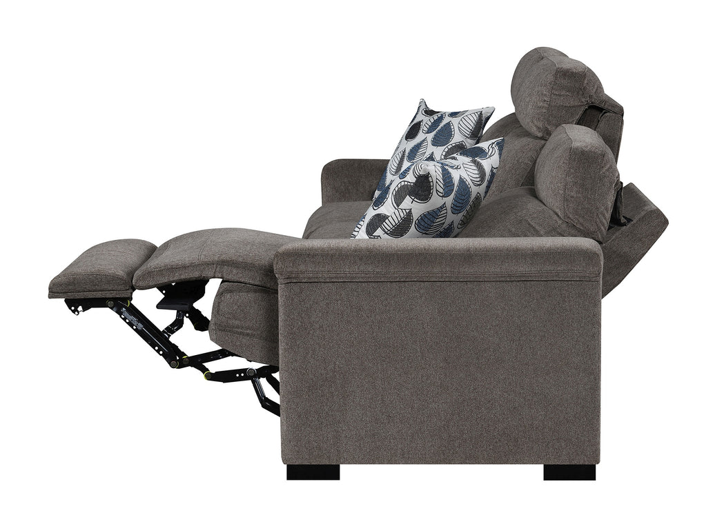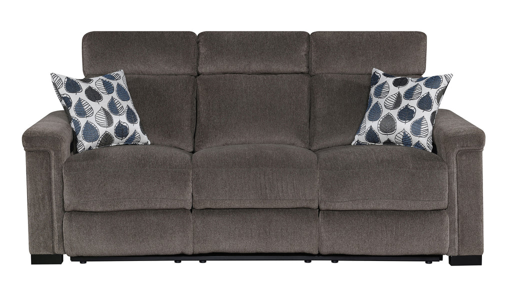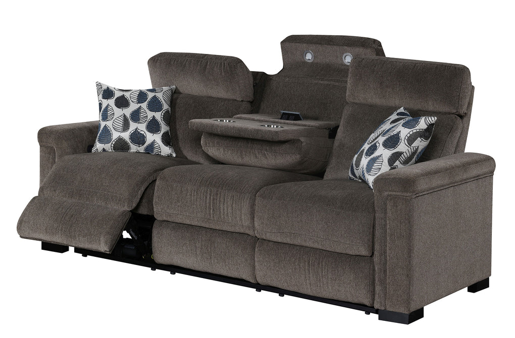 Power Reclining sofa with power headrest, dropdown table, dimmable reading light. power outlets, stainless steel cupholder, hidden controls w/USB , and made up in a microdenier chenille with a pair of accent pillows.