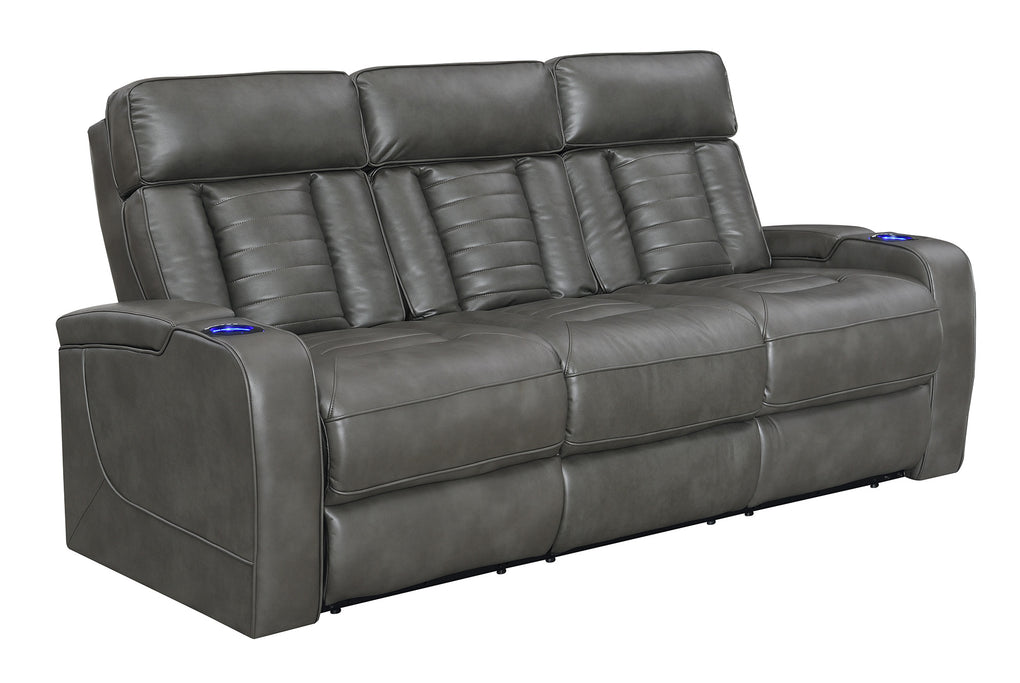 Power Reclining sofa with power headrest, dropdown table, reading light, power outlets and wireless qi charging, lighted cupholder controls with USB, arm storage, and made up in a breathable polyurethane that provides durability and comfort.