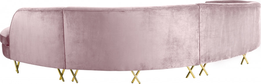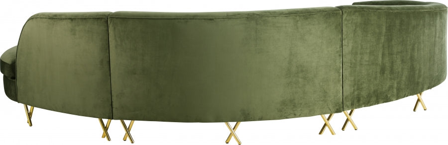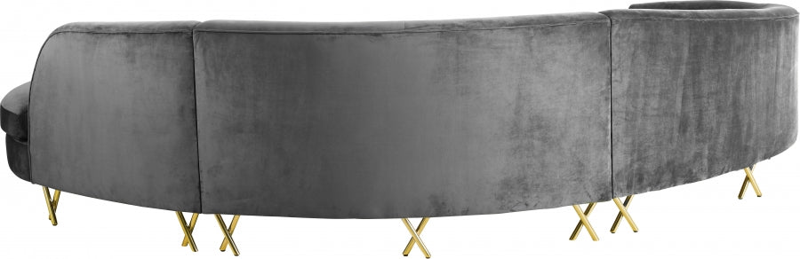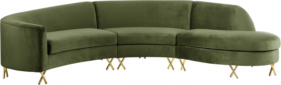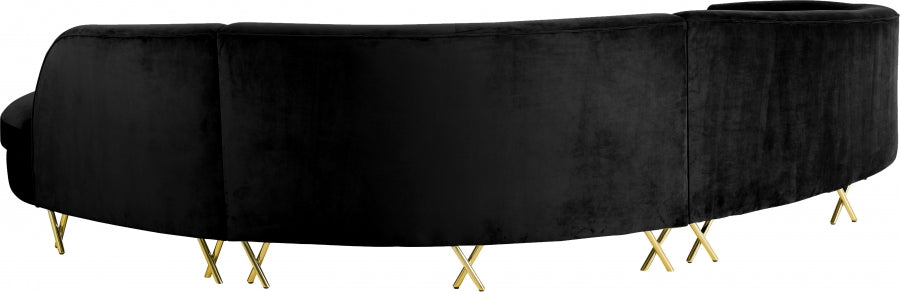 Relax in regal comfort with this stunning black velvet Serpentine three-piece sectional sofa. Plush black velvet upholstery provides a soft, cozy place for you to rest after a long day, and gold steel legs add just the barest touch of color to the sectional’s chic design. Its lengthy design offers ample room for you to kick back and relax, either on your own after a long, hard day, or with your loved ones during family movie night.
