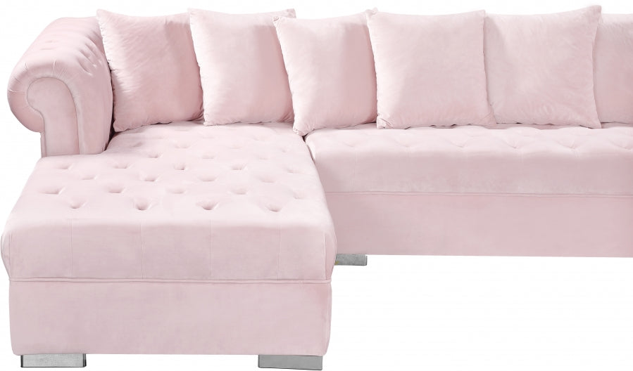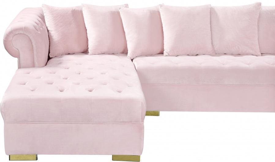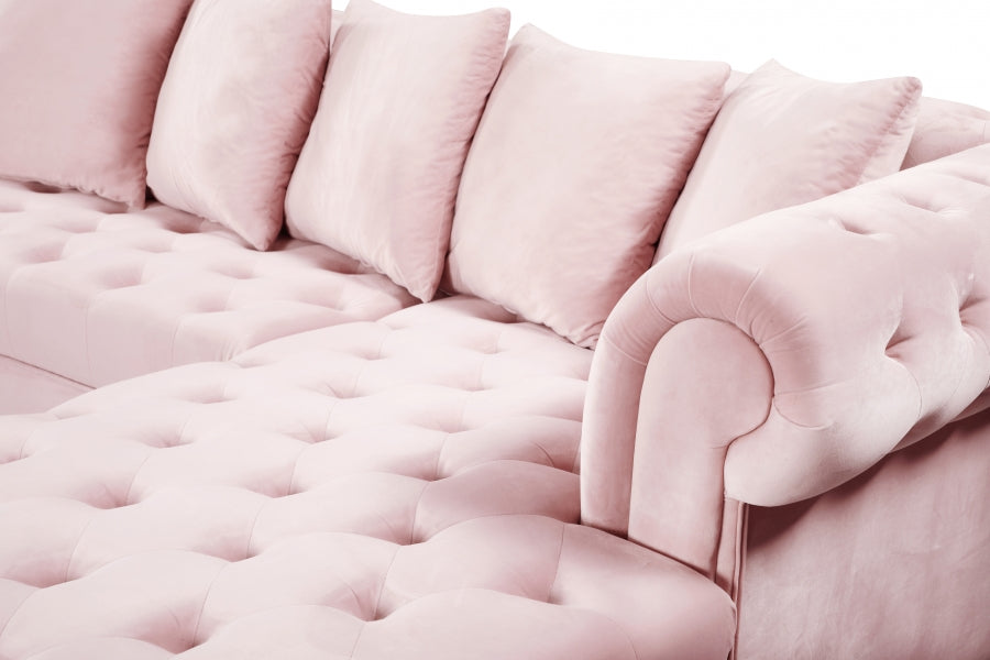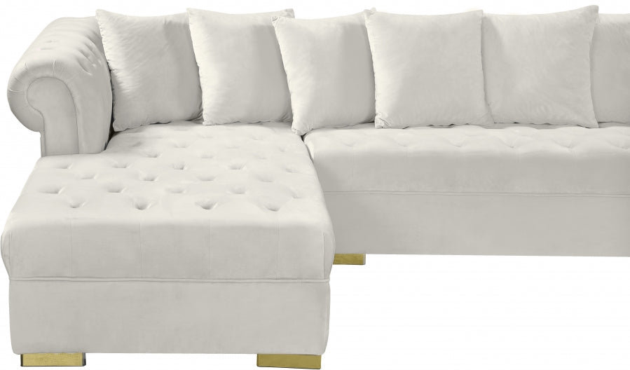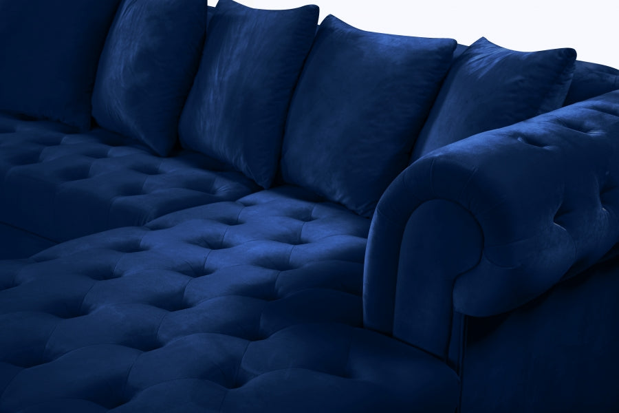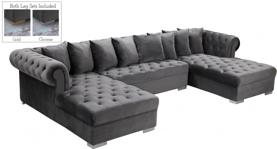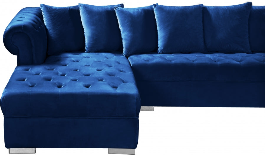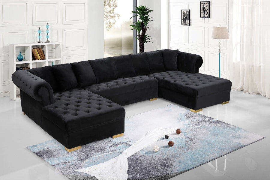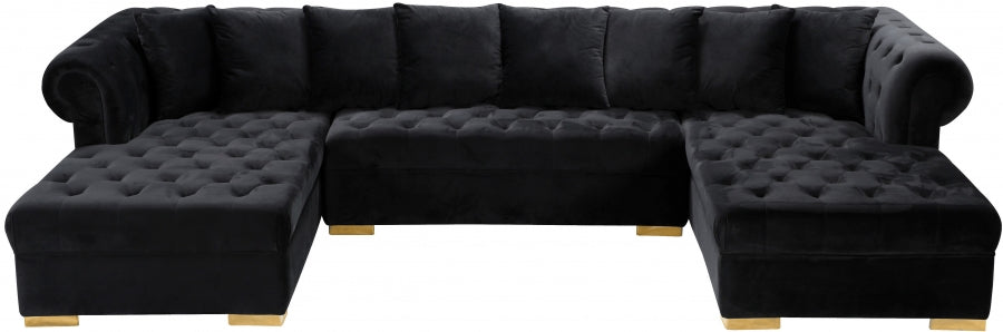 Get ready to relax after a long day with this Presley Black Velvet 3pc. Sectional from Meridian Furniture. Featuring rich black velvet upholstery with deep tufting and comfy pillows, this double chaise sectional provides a luxurious, cozy space to kick back and watch TV, take a nap, or curl up with a nice book. Complete sets of gold and chrome legs complement your contemporary home decor while providing solid support for the sectional's frame.