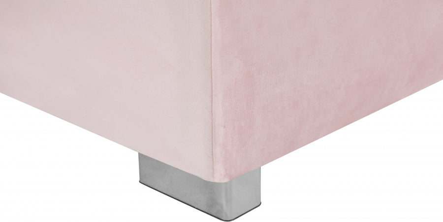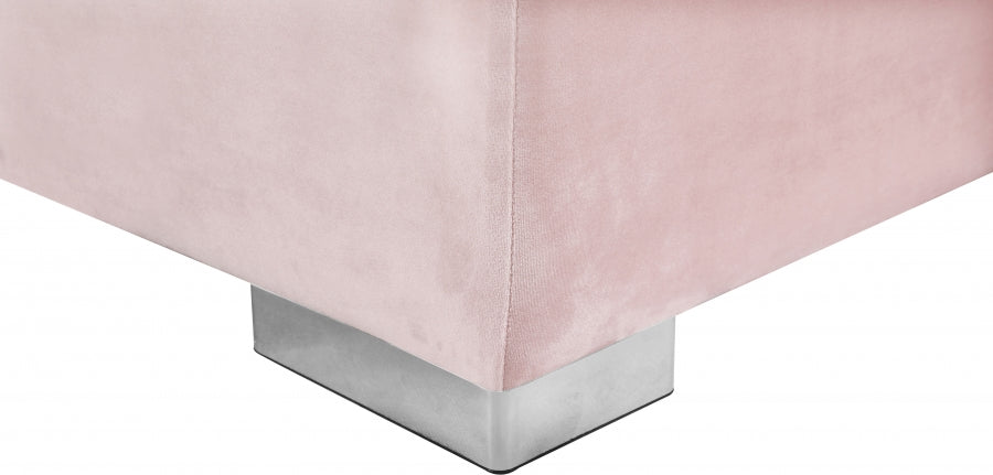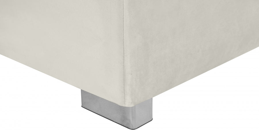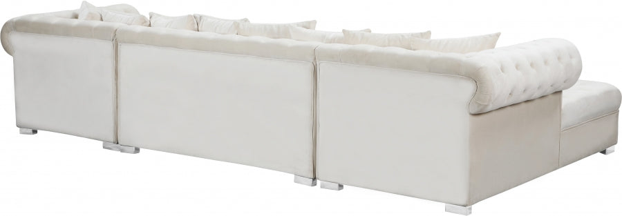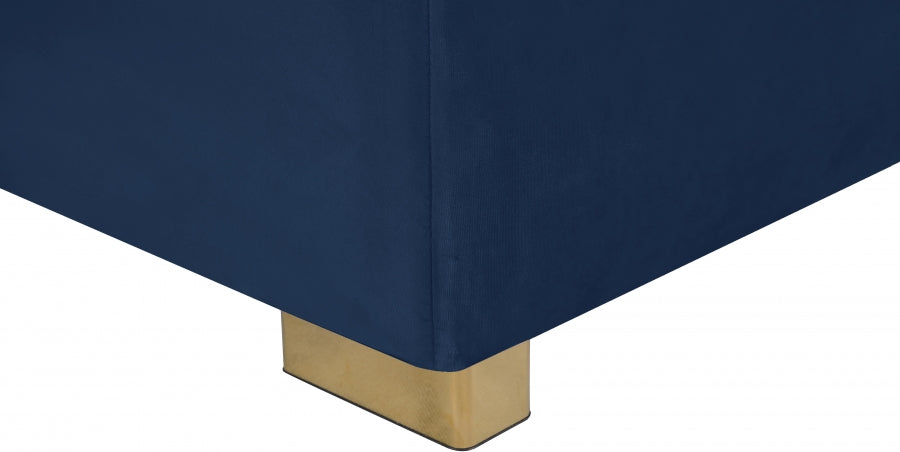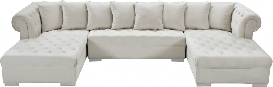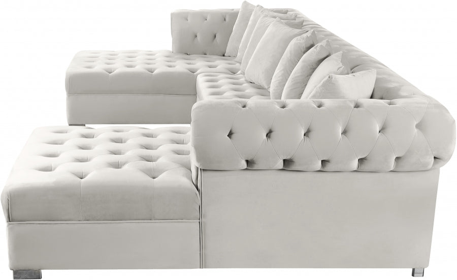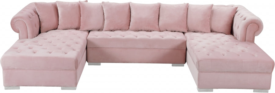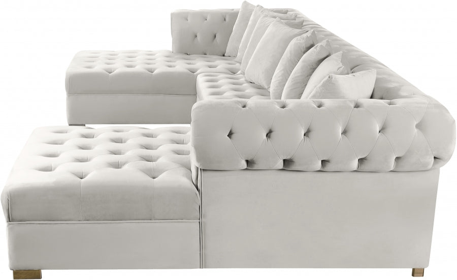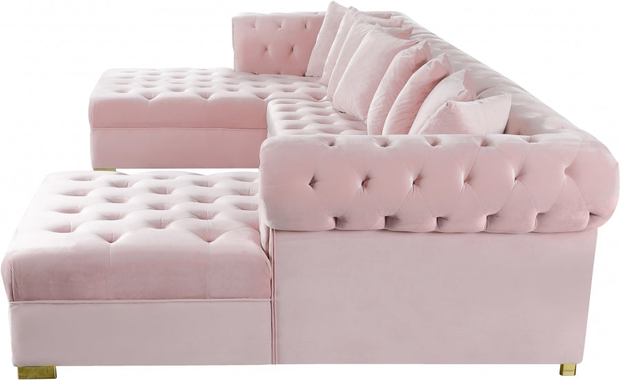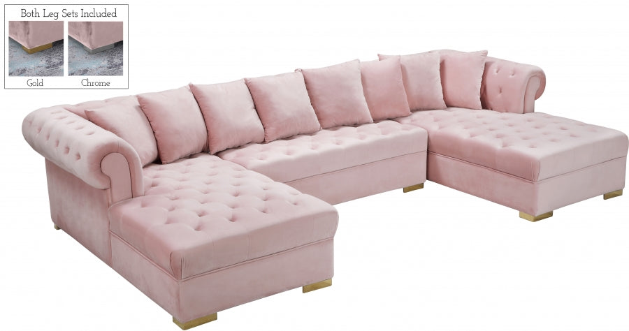Get ready to relax after a long day with this Presley Black Velvet 3pc. Sectional from Meridian Furniture. Featuring rich black velvet upholstery with deep tufting and comfy pillows, this double chaise sectional provides a luxurious, cozy space to kick back and watch TV, take a nap, or curl up with a nice book. Complete sets of gold and chrome legs complement your contemporary home decor while providing solid support for the sectional's frame.